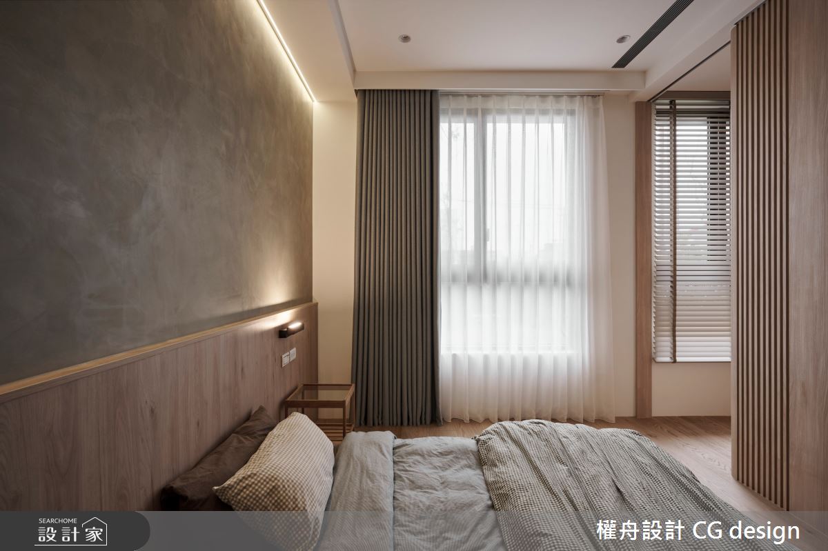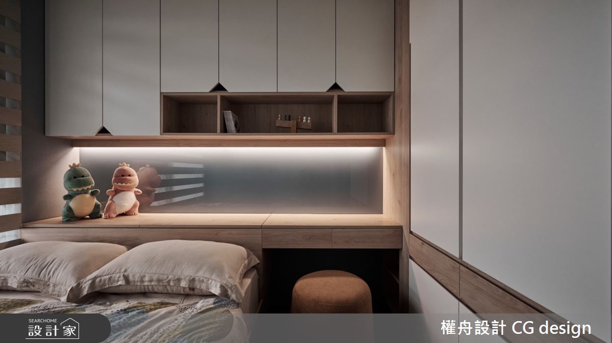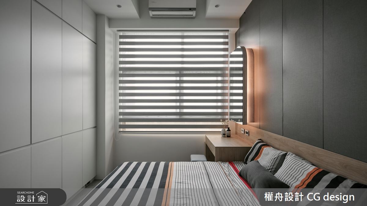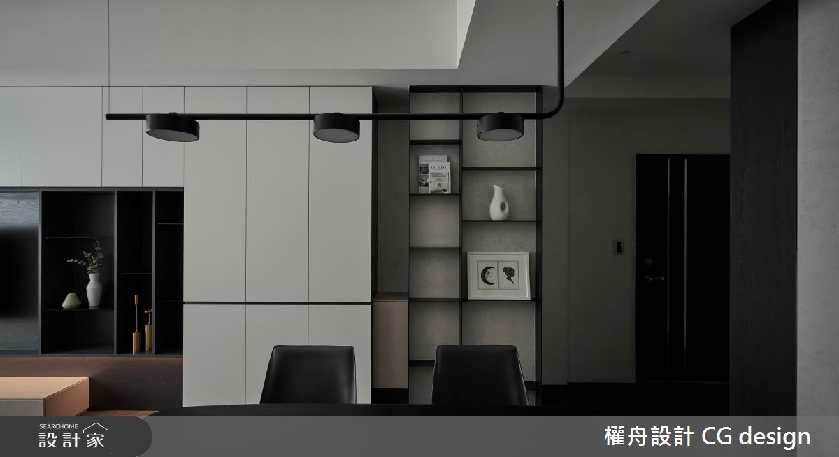 權舟室內設計有限公司以乳膠漆、超耐磨木地板、鐵件、灰鏡、木作貼皮、烤漆、系統板材、木百葉、軌道燈的搭配應用,呈現混搭風居家氛圍,將此間21坪、三房、單層、新成屋(5年以下)打造成舒適愜意的家庭空間,完成2位大人、1位小孩全家人的夢想之居。