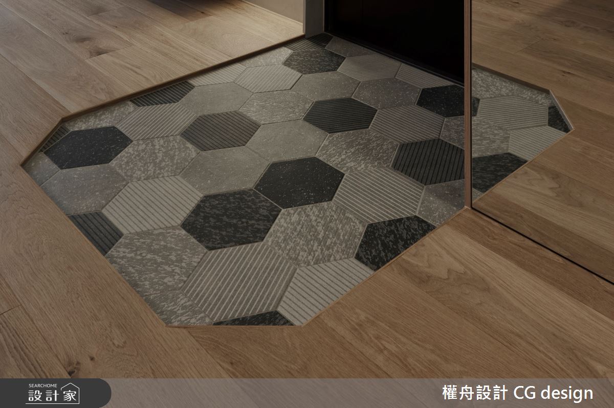 權舟室內設計有限公司以乳膠漆、六角磚/蜂巢磚、木地板、木作貼皮、系統板材、人造石的搭配應用,呈現混搭風居家氛圍,將此間26坪、兩房、單層、新成屋(5年以下)打造成舒適愜意的家庭空間,完成2位大人全家人的夢想之居。