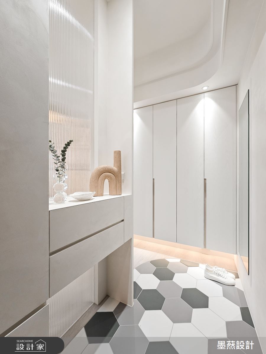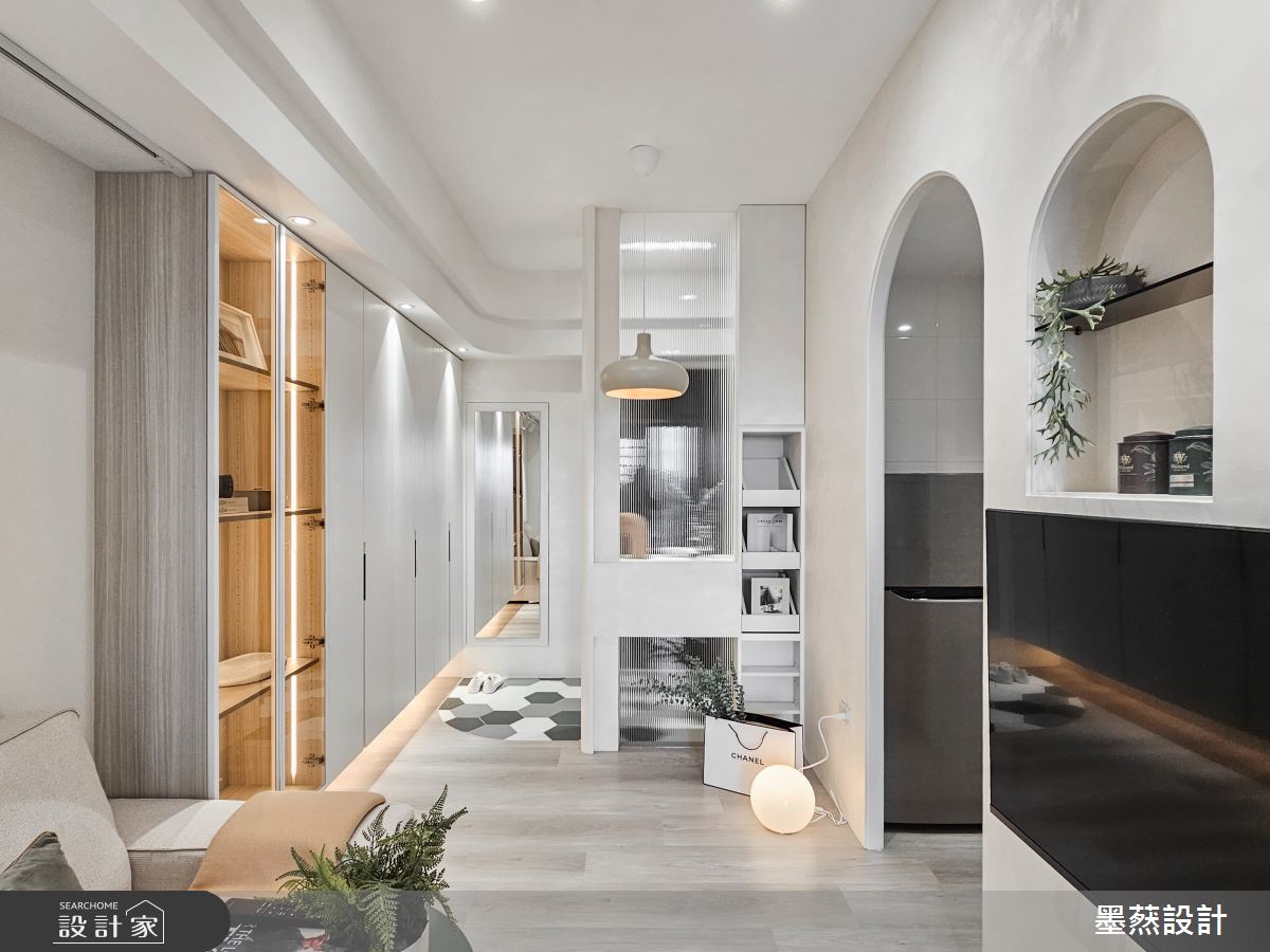 來自墨䔳設計/墨璞情境的9.23坪現代風住宅案,屋主一家人共有2位大人,是一間單層毛胚屋的一房格局,設計師藉由建材以進口六角磚、義大利特殊塗料、軌道燈、小冰柱玻璃、木地板的搭配應用,實現一家人的理想生活。