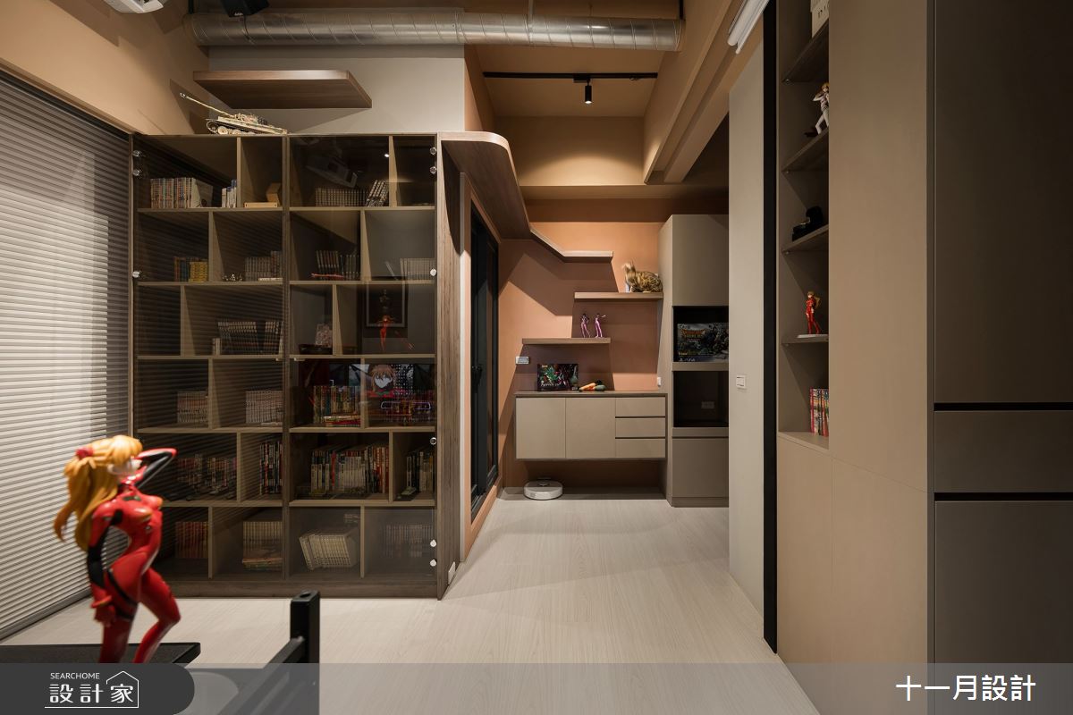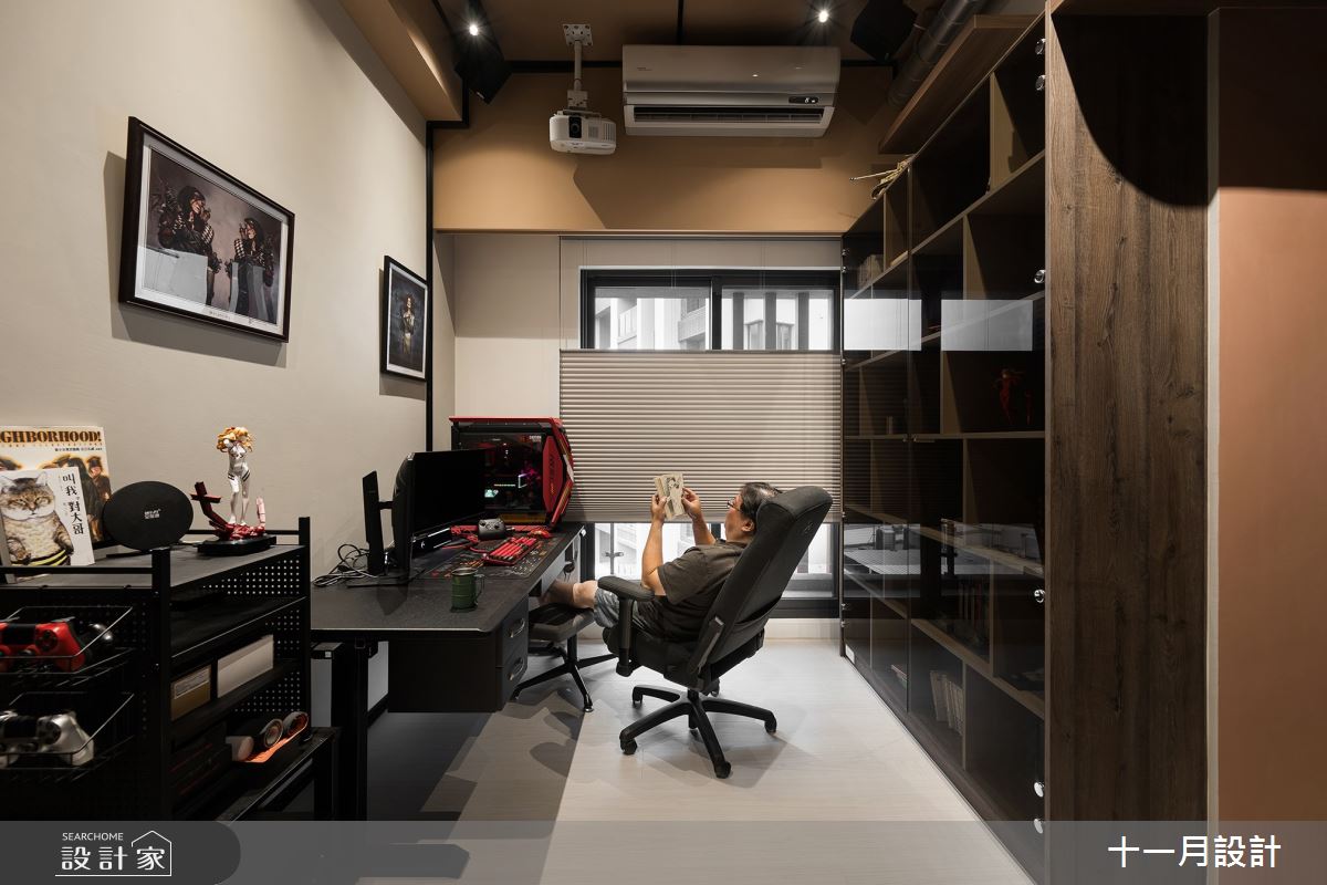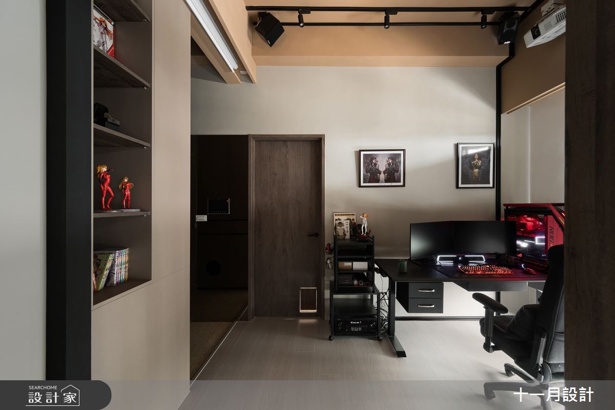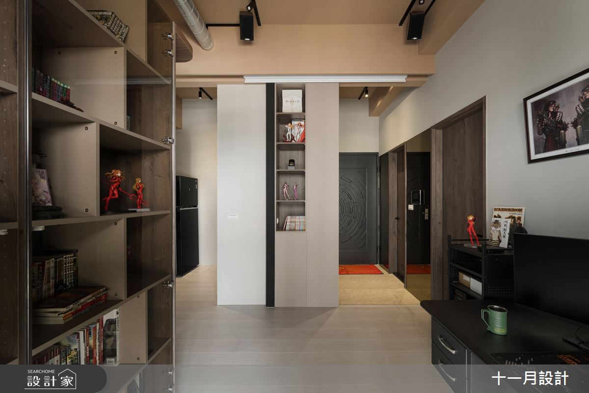 十一月設計以油漆、乳膠漆、超耐磨木地板、系統板材、磁磚、軌道燈的搭配應用,呈現工業風居家氛圍,將此間15坪、一房、單層、新成屋(5年以下)打造成舒適愜意的家庭空間,完成2位大人全家人的夢想之居。