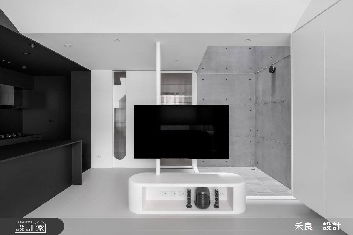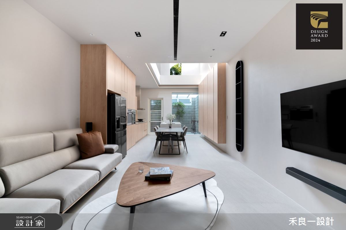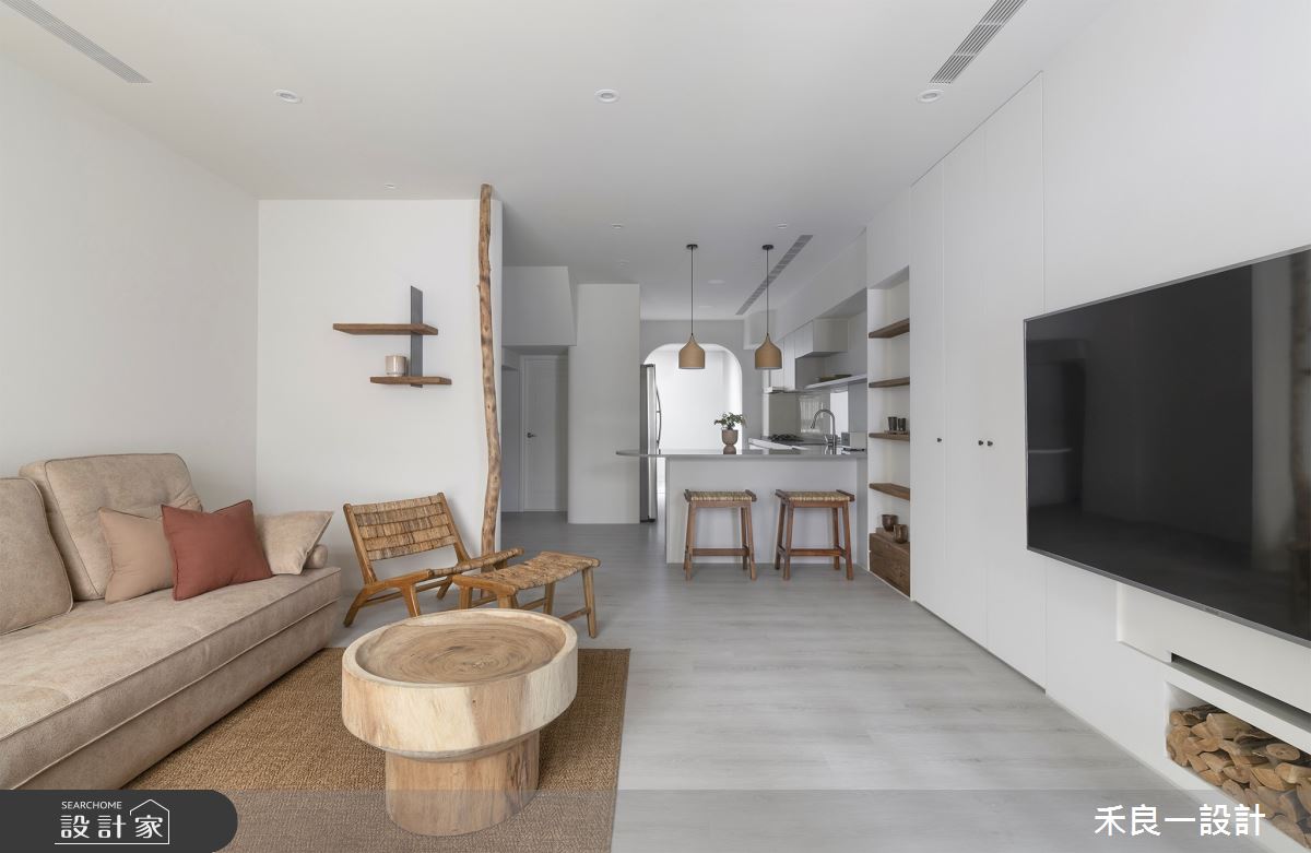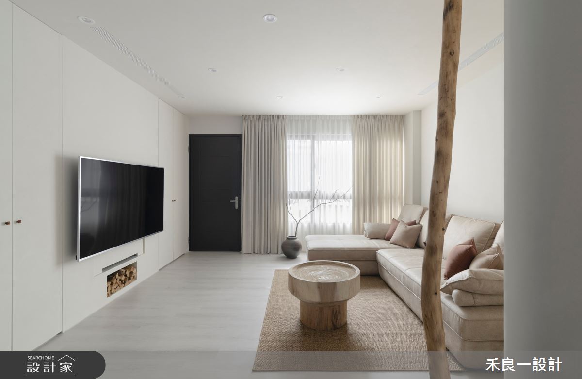 禾良一設計以油漆、水泥漆、超耐磨木地板、鐵件、茶玻、烤玻、鍍鈦金屬、藝術漆、無縫藝術塗料、美耐板、電動蛇簾、石英石的搭配應用,呈現現代風居家氛圍,將此間25坪、三房、單層、中古屋(5~15年)打造成舒適愜意的家庭空間,完成2位大人、1位小孩全家人的夢想之居。