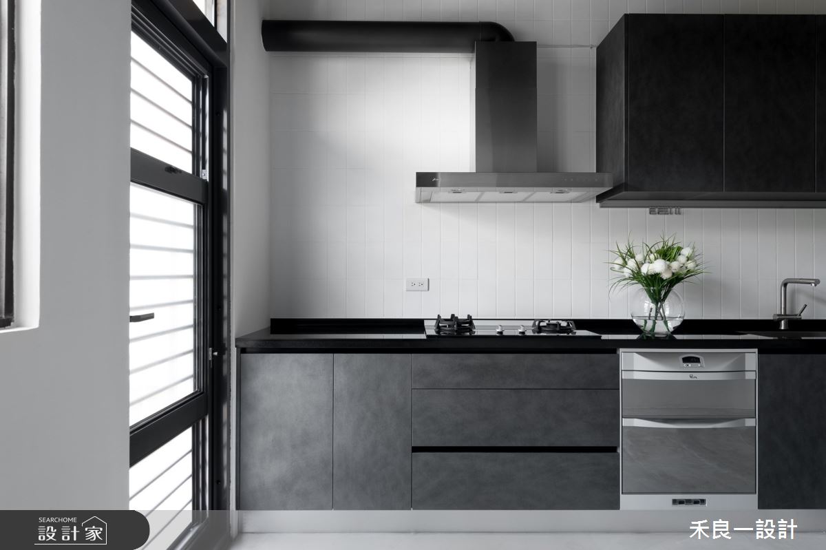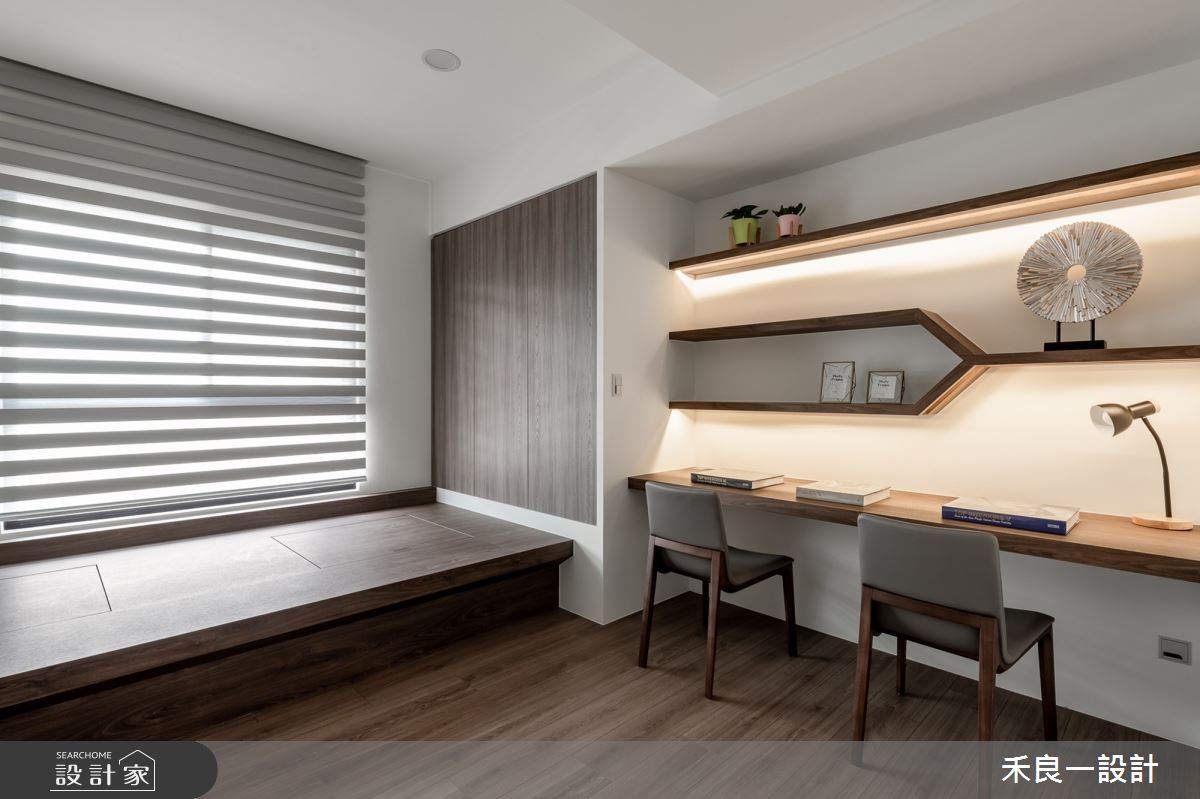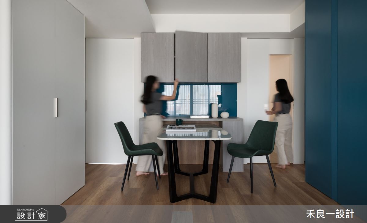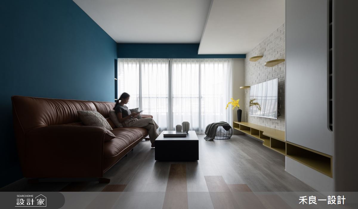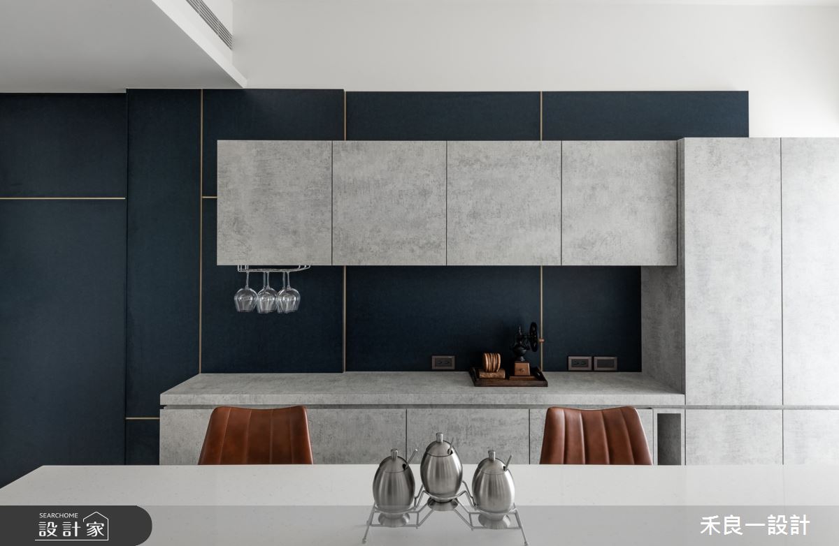 禾良一設計以油漆、水泥漆、超耐磨木地板、鐵件、茶玻、烤玻、鍍鈦金屬、藝術漆、無縫藝術塗料、美耐板、電動蛇簾、石英石的搭配應用,呈現現代風居家氛圍,將此間25坪、三房、單層、中古屋(5~15年)打造成舒適愜意的家庭空間,完成2位大人、1位小孩全家人的夢想之居。