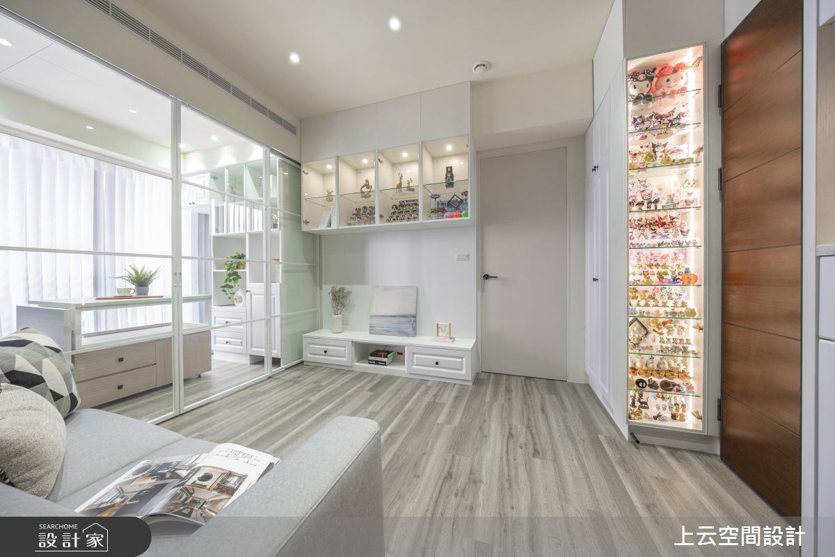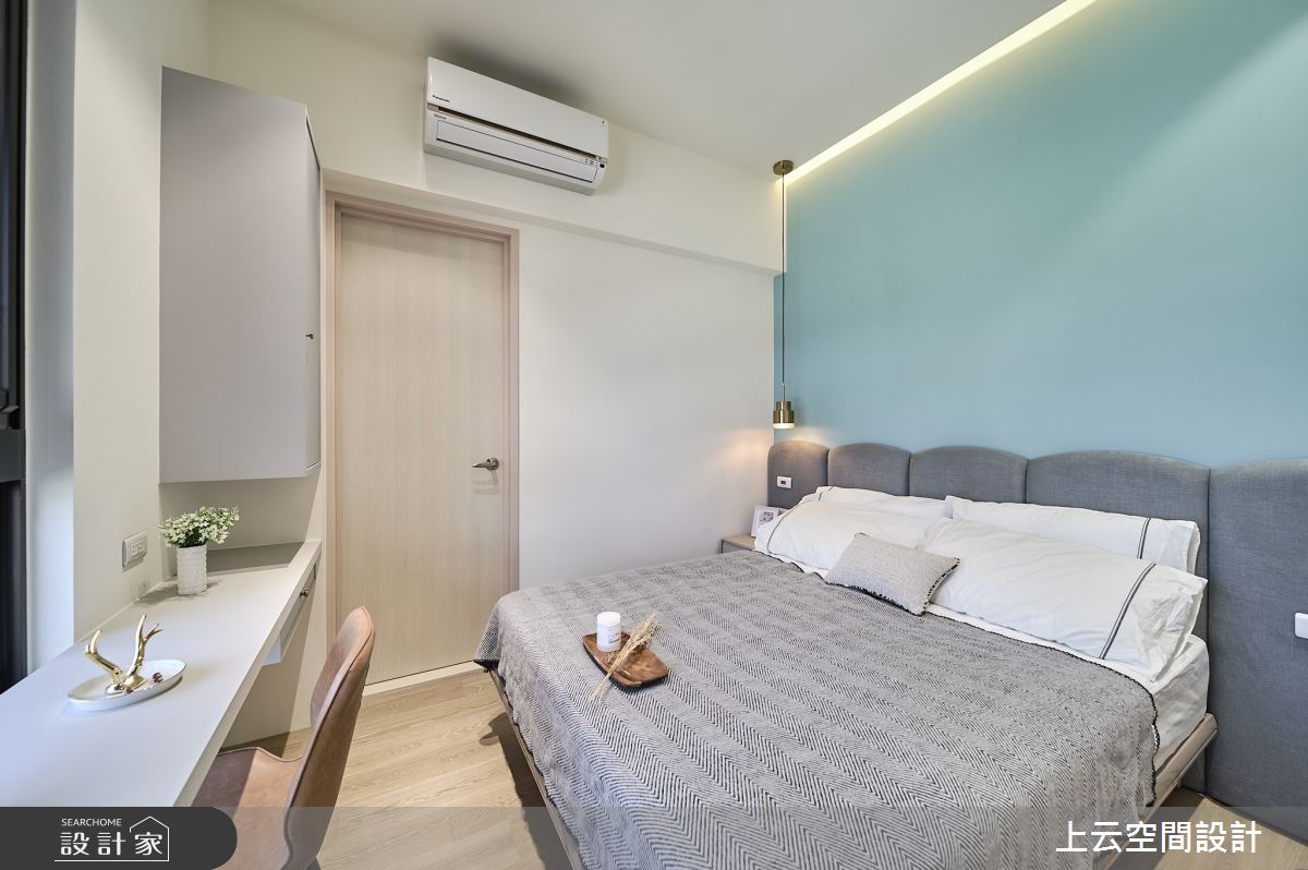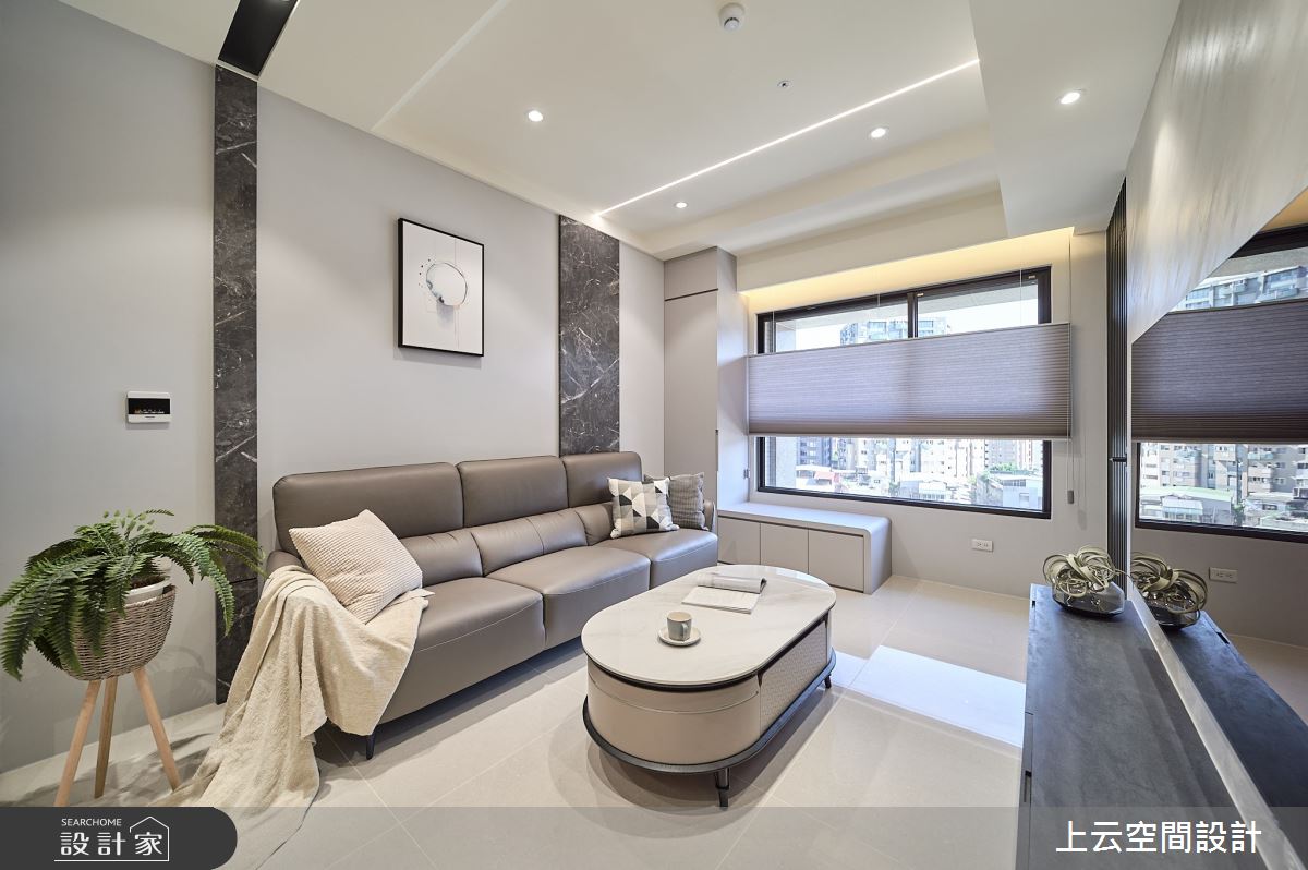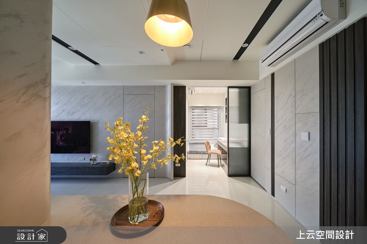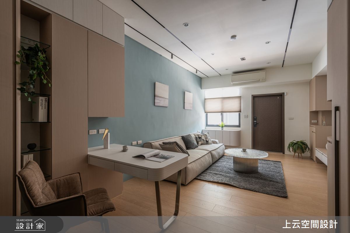 上云空間設計以水泥漆、木作貼皮、系統板材、鐵件、磁磚、特殊漆、長虹玻璃的搭配應用,呈現現代簡約輕古典風居家氛圍,將此間21坪、三房、單層、新成屋(5年以下)打造成舒適愜意的家庭空間,完成2位大人、1位小孩全家人的夢想之居。