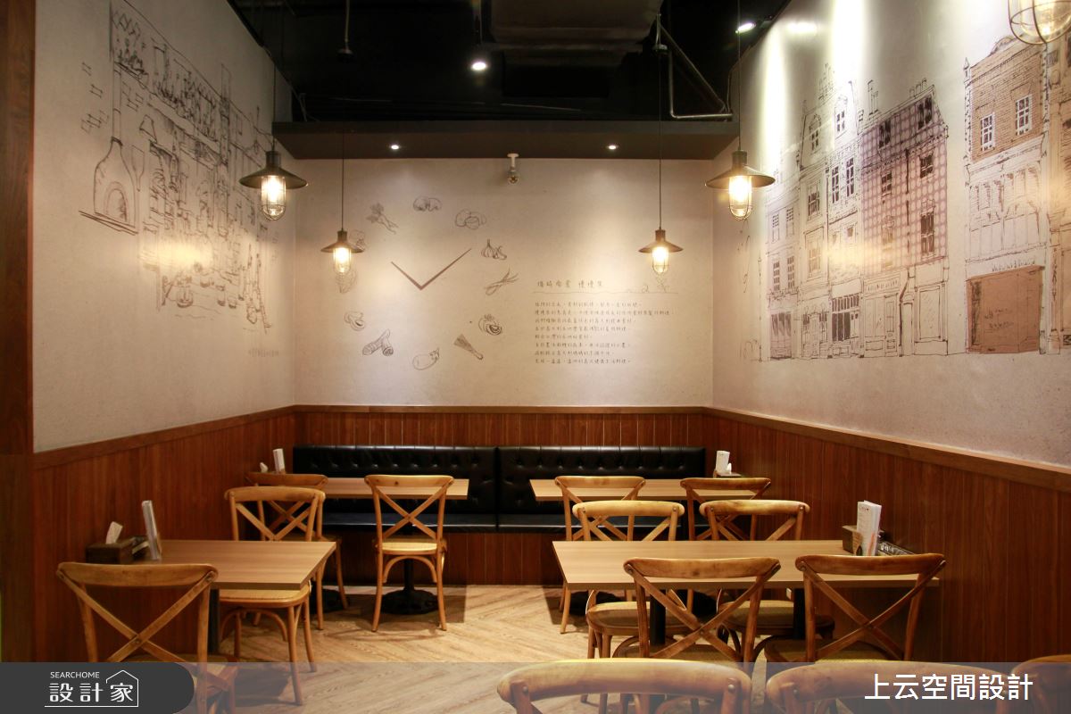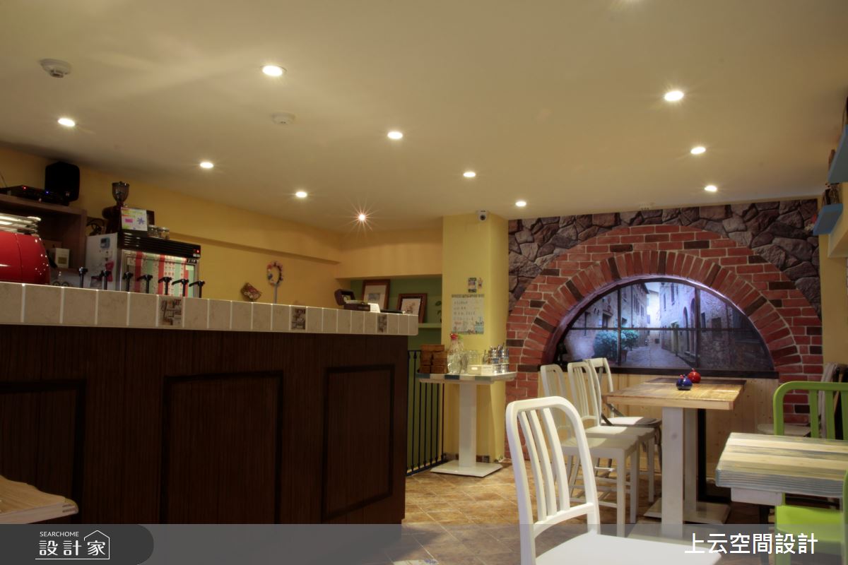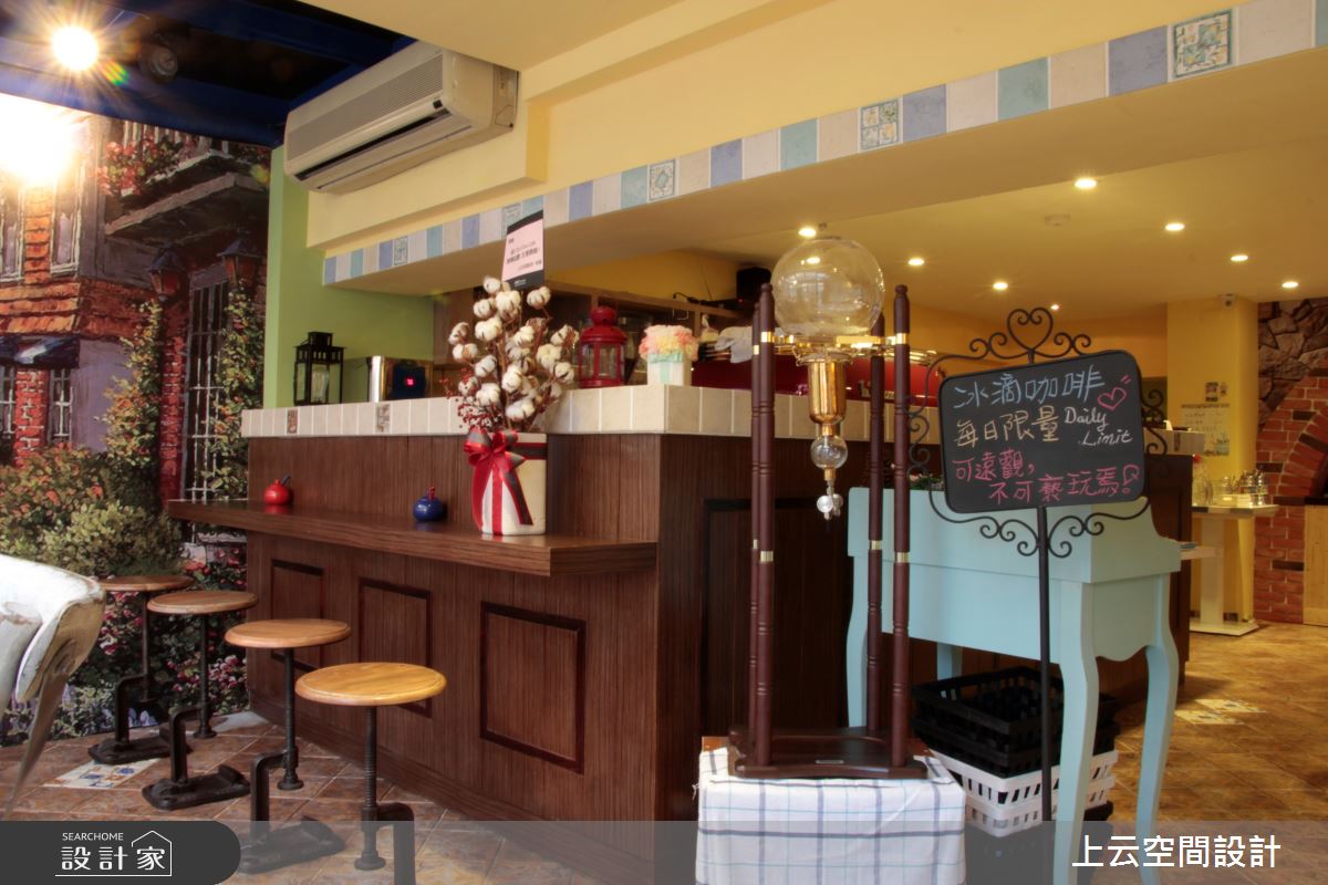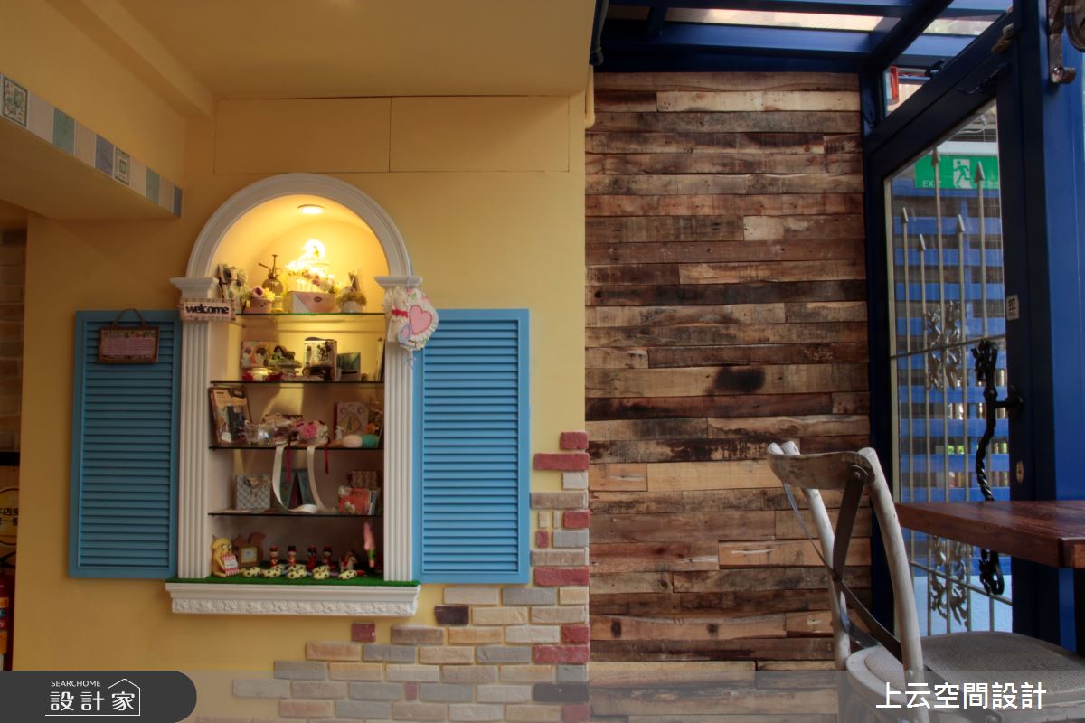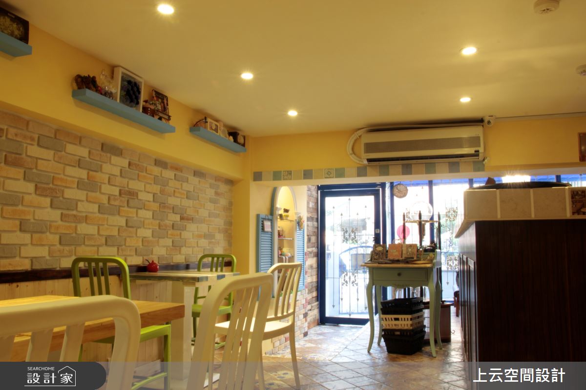 上云空間設計以六角磚/蜂巢磚、花磚、大圖輸出、文化石、水泥漆、鐵件、鋼刷木皮、磁磚、線板的搭配應用,呈現鄉村風的風格氣息,將此間27坪老屋(16~30年)優雅詮釋成舒適愜意的商業空間。