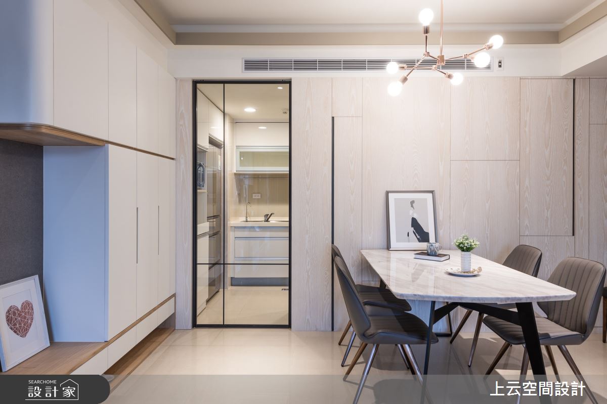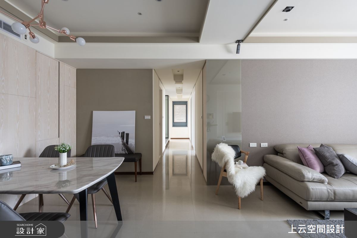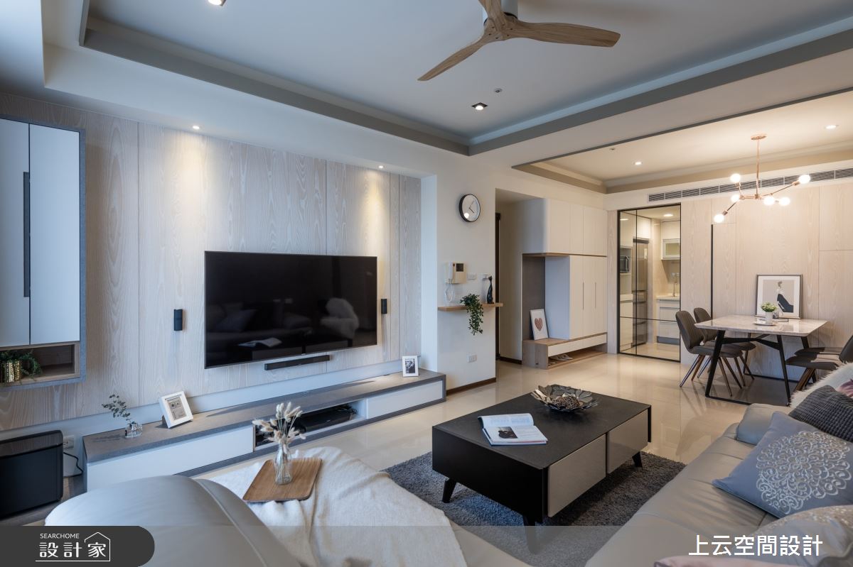 來自上云空間設計的44坪現代風住宅案,屋主一家人共有2位大人,是一間單層新成屋(5年以下)的四房格局,設計師藉由建材以乳膠漆、石英磚/拋光石英磚、鐵件、灰鏡、烤漆、鋼刷木皮、系統板材、噴漆、噴砂玻璃、特殊漆的搭配應用,實現一家人的理想生活。