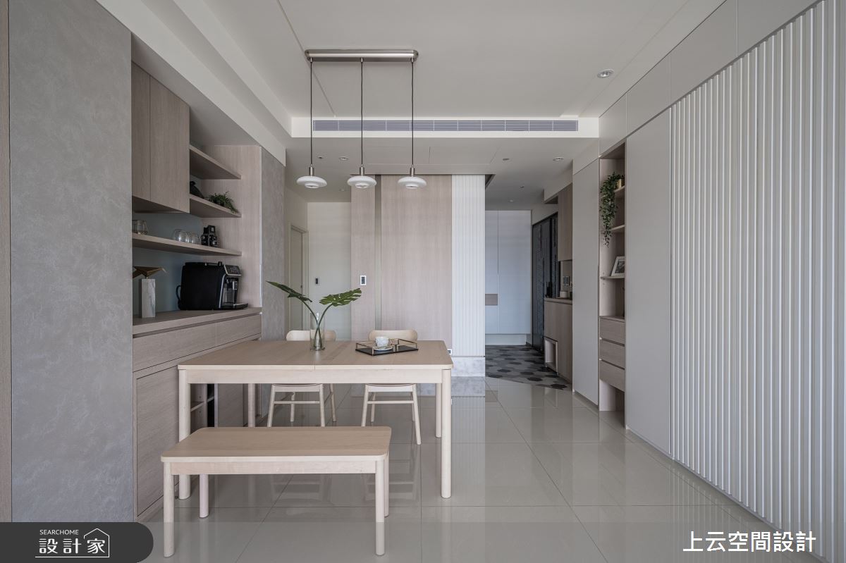 上云空間設計以乳膠漆、六角磚/蜂巢磚、超耐磨木地板、石英磚/拋光石英磚、木作貼皮、烤漆、系統板材、繃布、噴漆、特殊漆的搭配應用,呈現北歐風居家氛圍,將此間25.5坪、三房、單層、新成屋(5年以下)打造成舒適愜意的家庭空間,完成2位大人、2位小孩、1位長輩全家人的夢想之居。