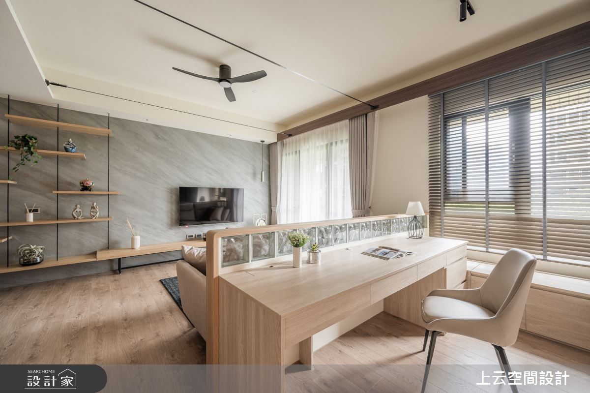 上云空間設計以乳膠漆、噴漆、木作貼皮、鋼刷木皮、系統板材、石材、六角磚/蜂巢磚、繃布、木百葉、鐵件、超耐磨木地板、石英磚/拋光石英磚、鋁線燈、特殊漆、玻璃磚的搭配應用,呈現人文禪風居家氛圍,將此間30坪、三房、單層、新成屋(5年以下)打造成舒適愜意的家庭空間,完成2位大人、2位小孩全家人的夢想之居。