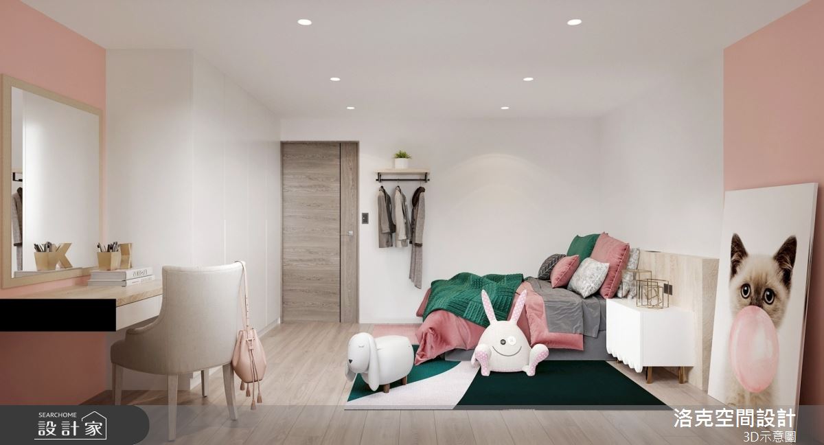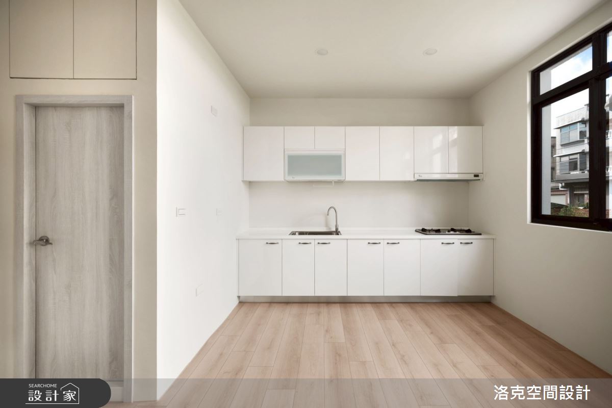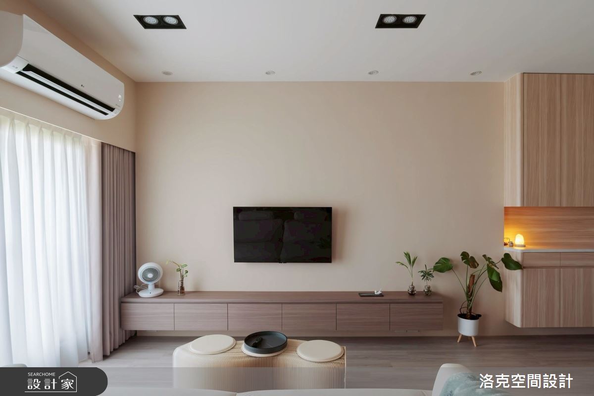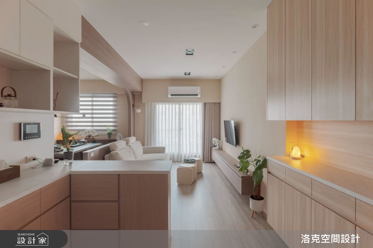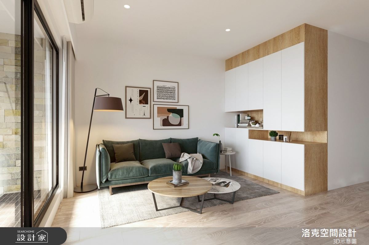 洛克空間設計開發有限公司以卡扣木地板、牆面跳色漆、系統櫃、訂製傢俱、造型木作的搭配應用,呈現簡約風居家氛圍,將此間16坪、兩房、單層、新成屋(5年以下)打造成舒適愜意的家庭空間,完成1位大人全家人的夢想之居。