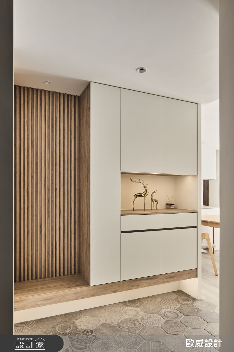 來自歐威室內設計有限公司的25坪北歐風住宅案,屋主一家人共有2位大人,是一間單層新成屋(5年以下)的三房格局,設計師藉由建材以油漆、六角磚/蜂巢磚、超耐磨木地板、鐵件、灰鏡、鍍鈦金屬、木作貼皮、烤漆、系統板材的搭配應用,實現一家人的理想生活。