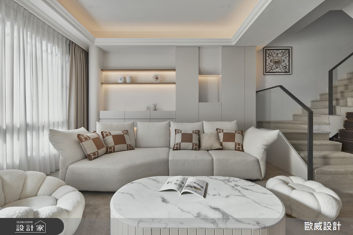 來自歐威室內設計有限公司的60坪住宅案,屋主一家人共有2位大人、1位小孩,是一間透天別墅中古屋(5~15年)的五房格局,設計師藉由建材以油漆、超耐磨木地板、鐵件、灰鏡、木作貼皮、烤漆、系統板材、大理石、磁磚、線板的搭配應用,實現一家人的理想生活。