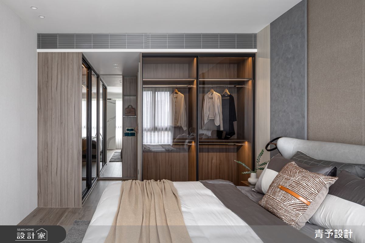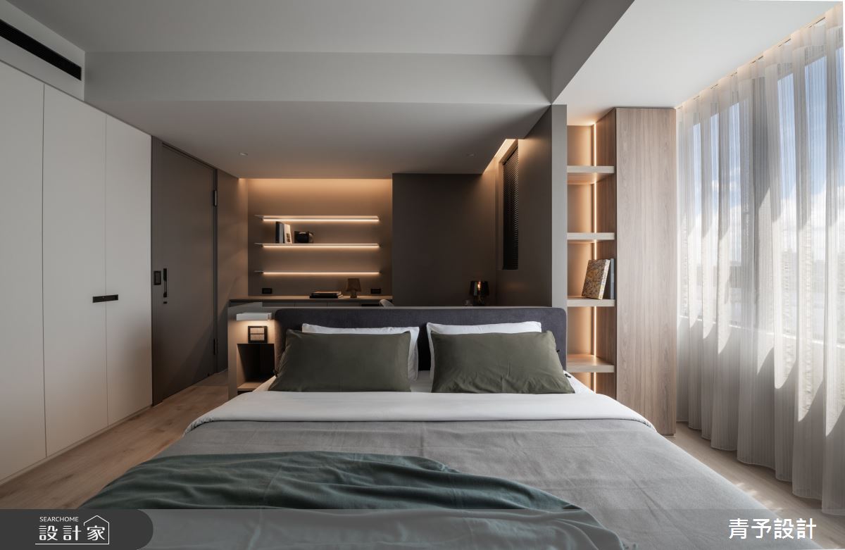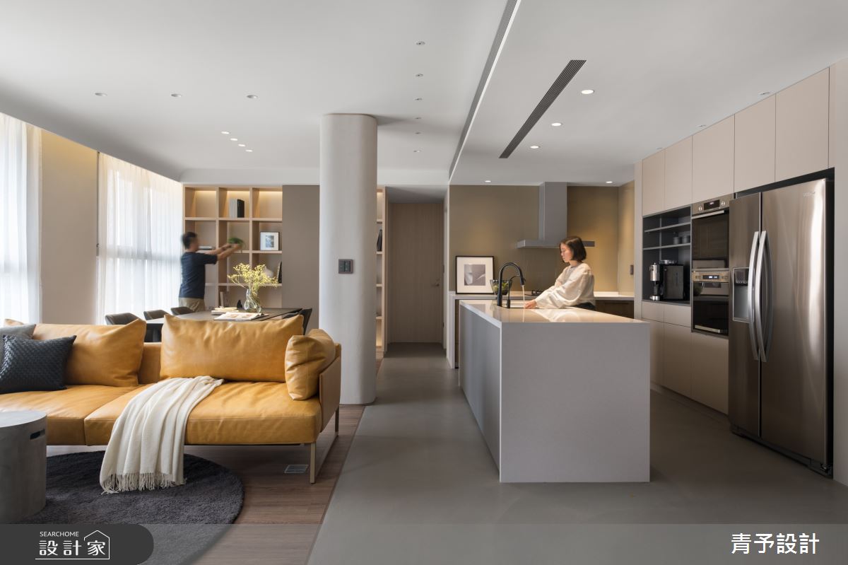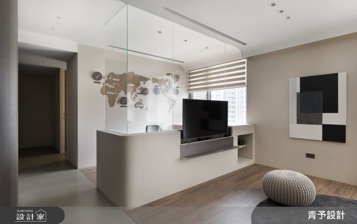 青予設計以氟酸玻璃、大板磚、特殊漆、鍍鈦金屬、鐵件、鋼刷木皮、超耐磨木地板、榻榻米、賽麗石、石材、繃布、線板、烤漆、噴漆、乳膠漆、壁紙、木作貼皮、系統板材的搭配應用,呈現現代風居家氛圍,將此間38坪、三房、單層、新成屋(5年以下)打造成舒適愜意的家庭空間,完成2位大人、2位小孩全家人的夢想之居。
