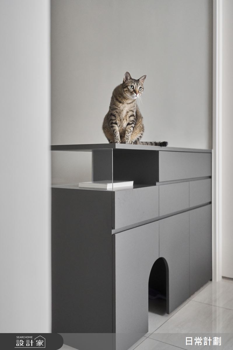 日常計劃空間設計以乳膠漆、超耐磨木地板、噴漆、美耐板貼皮的搭配應用,呈現混搭風居家氛圍,將此間16坪、兩房、單層、新成屋(5年以下)打造成舒適愜意的家庭空間,完成2位大人全家人的夢想之居。