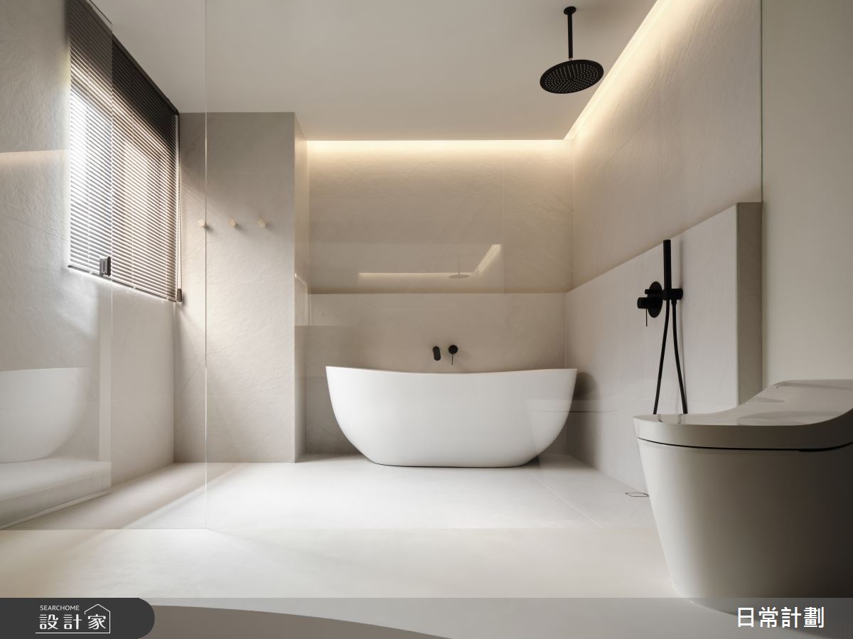 日常計劃空間設計以乳膠漆、超耐磨木地板、鐵件、造型玻璃、木作貼皮、系統板材、磁磚、木百葉、賽麗石、軌道燈、噴漆、蜂巢簾的搭配應用,呈現混搭風居家氛圍,將此間15.5坪、兩房、單層、新成屋(5年以下)打造成舒適愜意的家庭空間,完成1位大人全家人的夢想之居。