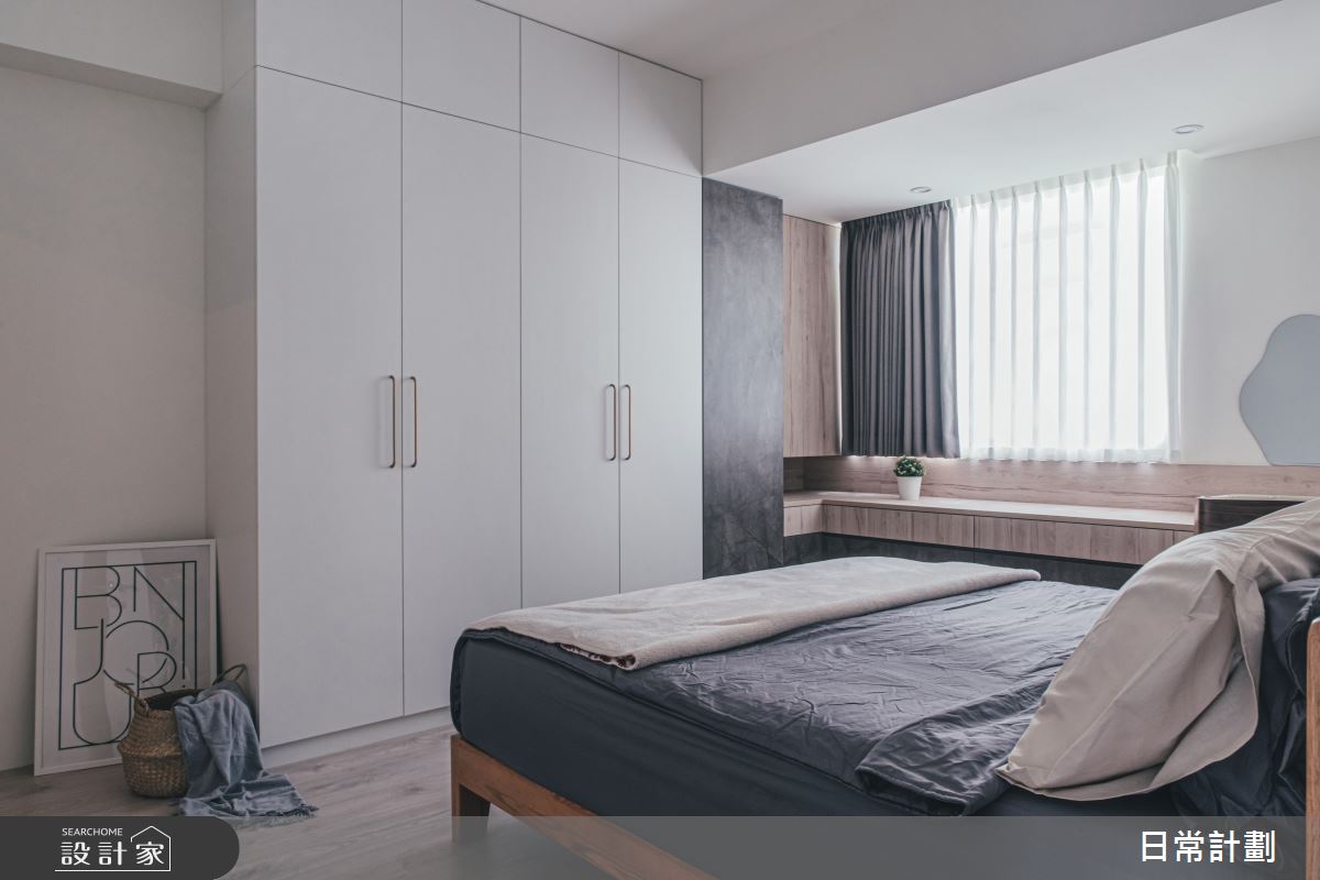 日常計劃空間設計以系統板、美耐板、超耐磨木地板、藝術塗料、花磚的搭配應用,呈現簡約風居家氛圍,將此間28坪、四房、單層、中古屋(5~15年)打造成舒適愜意的家庭空間,完成2位大人、1位小孩全家人的夢想之居。