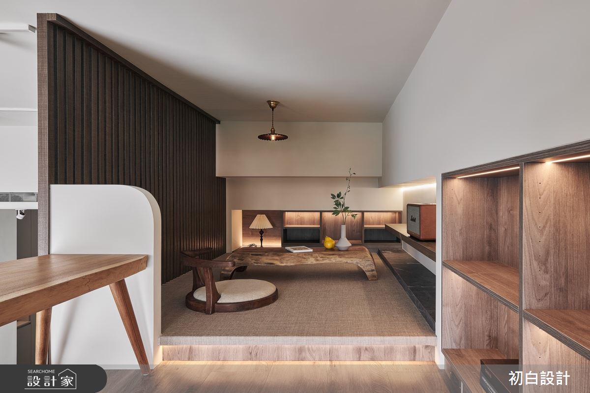 初白設計以系統板材、人造石、繃布、烤玻、特殊光源、進口瓷磚的搭配應用,呈現混搭風居家氛圍,將此間16坪、一房、單層、新成屋(5年以下)打造成舒適愜意的家庭空間,完成2位大人全家人的夢想之居。