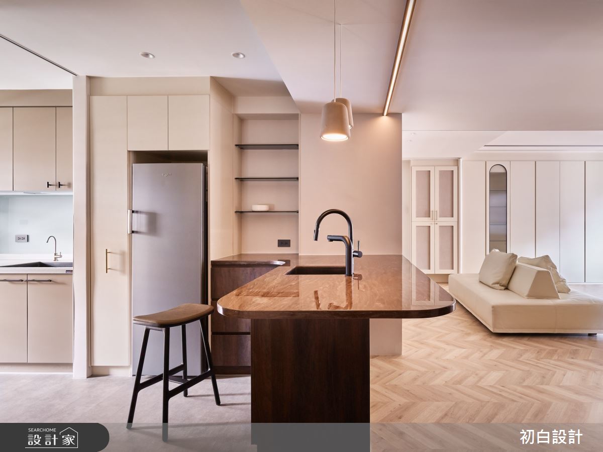 由初白設計精心規劃的15坪兩房住宅空間,家庭成員一共有2位大人。因應屋主需求,設計師運用混搭風作為主軸,搭配系統板材、人造石、繃布、烤玻、特殊光源、人字拼地板、格柵,打造全家人的夢想家居。