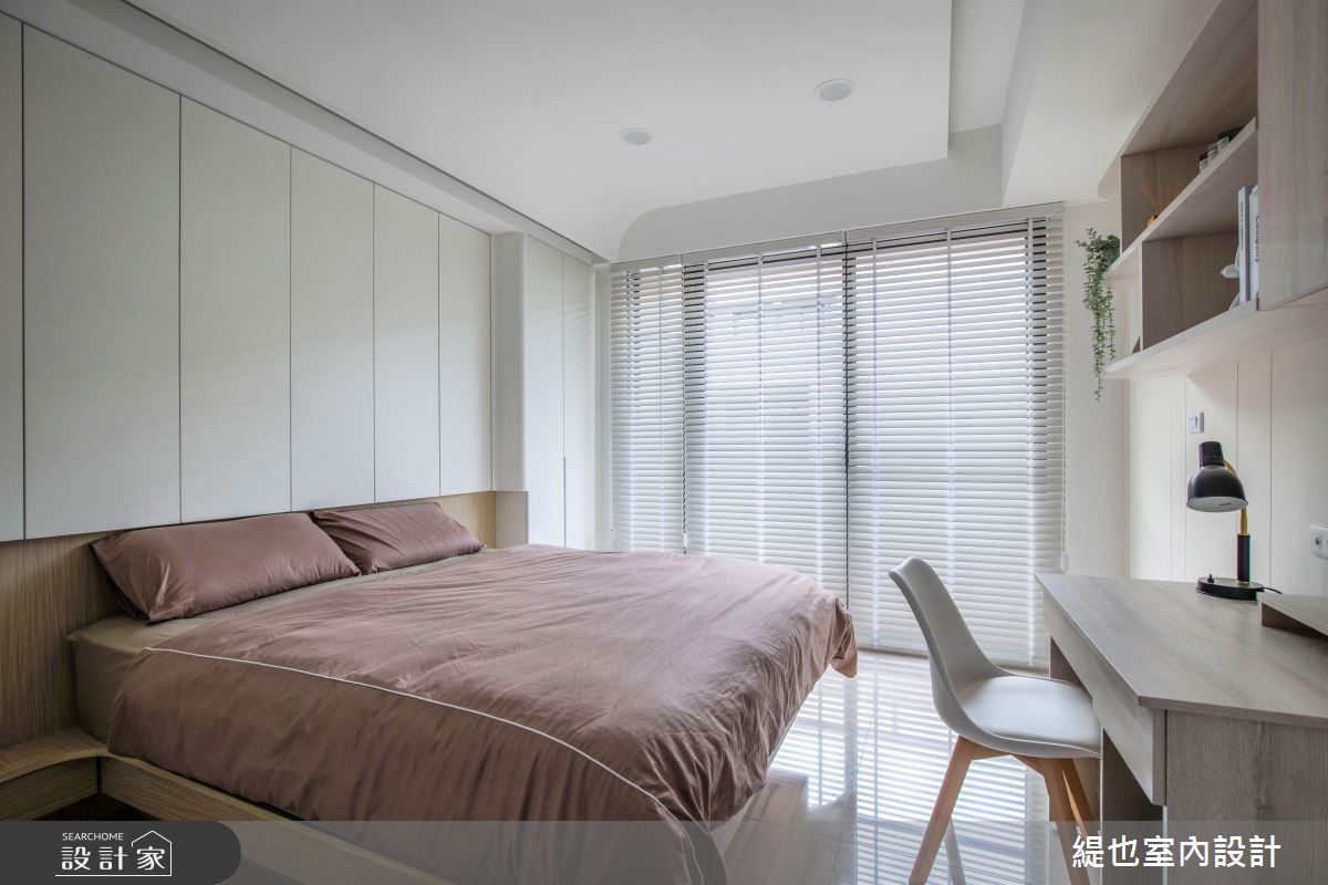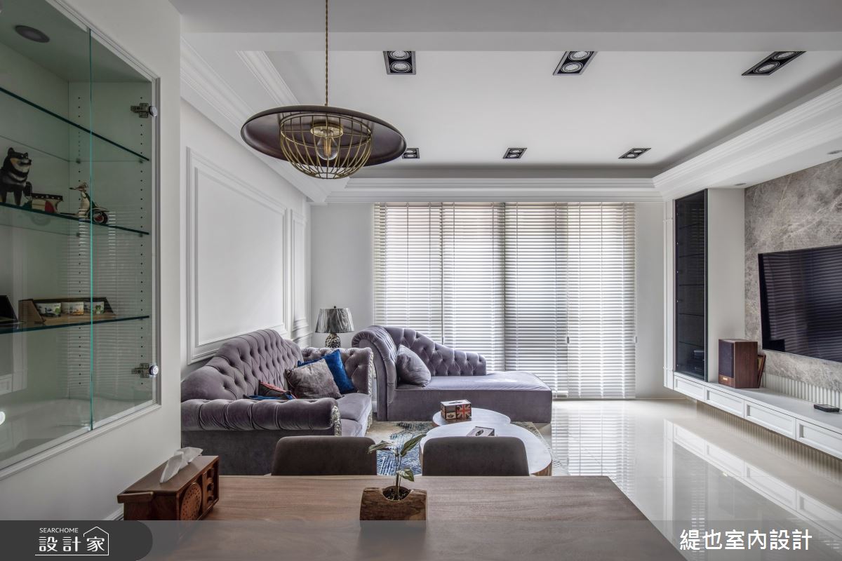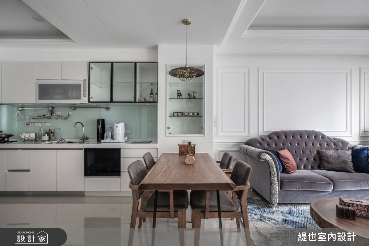 緹也室內設計以乳膠漆、木地板、石英磚/拋光石英磚、鍍鈦金屬、木作貼皮、烤漆、鋼刷木皮、繃布、線板、噴漆的搭配應用,呈現新古典居家氛圍,將此間24坪、三房、單層、預售屋打造成舒適愜意的家庭空間,完成2位大人全家人的夢想之居。