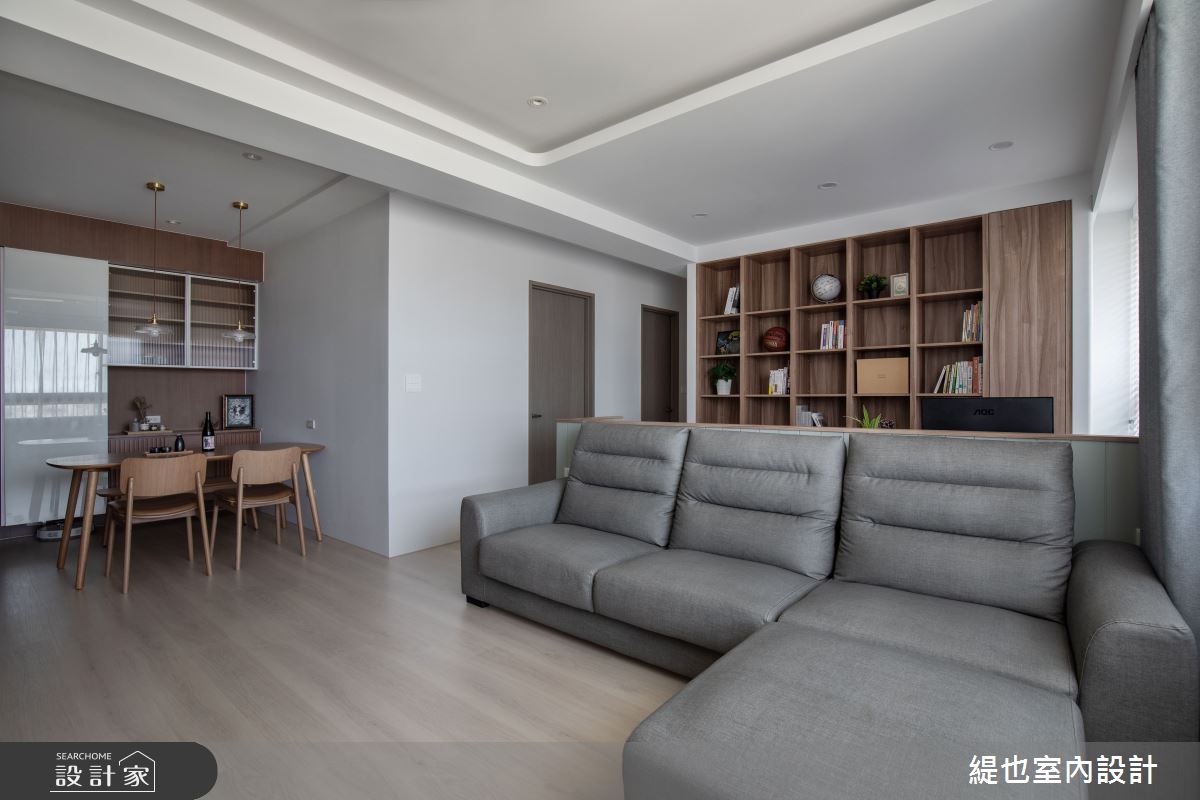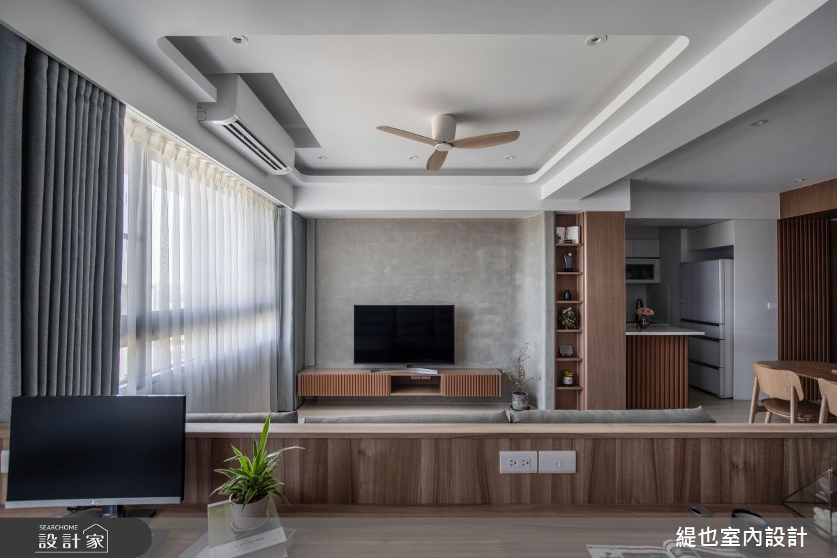 緹也室內設計以乳膠漆、超耐磨木地板、灰鏡、烤玻、木作貼皮、烤漆、系統板材、賽麗石、繃布、噴漆、壁布的搭配應用,呈現現代風居家氛圍,將此間36坪、三房、單層、預售屋打造成舒適愜意的家庭空間,完成2位大人、2位長輩全家人的夢想之居。