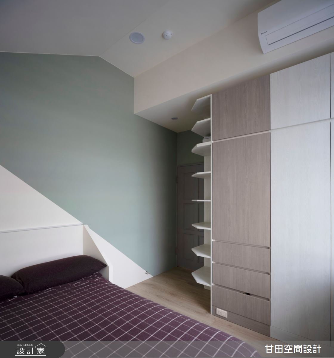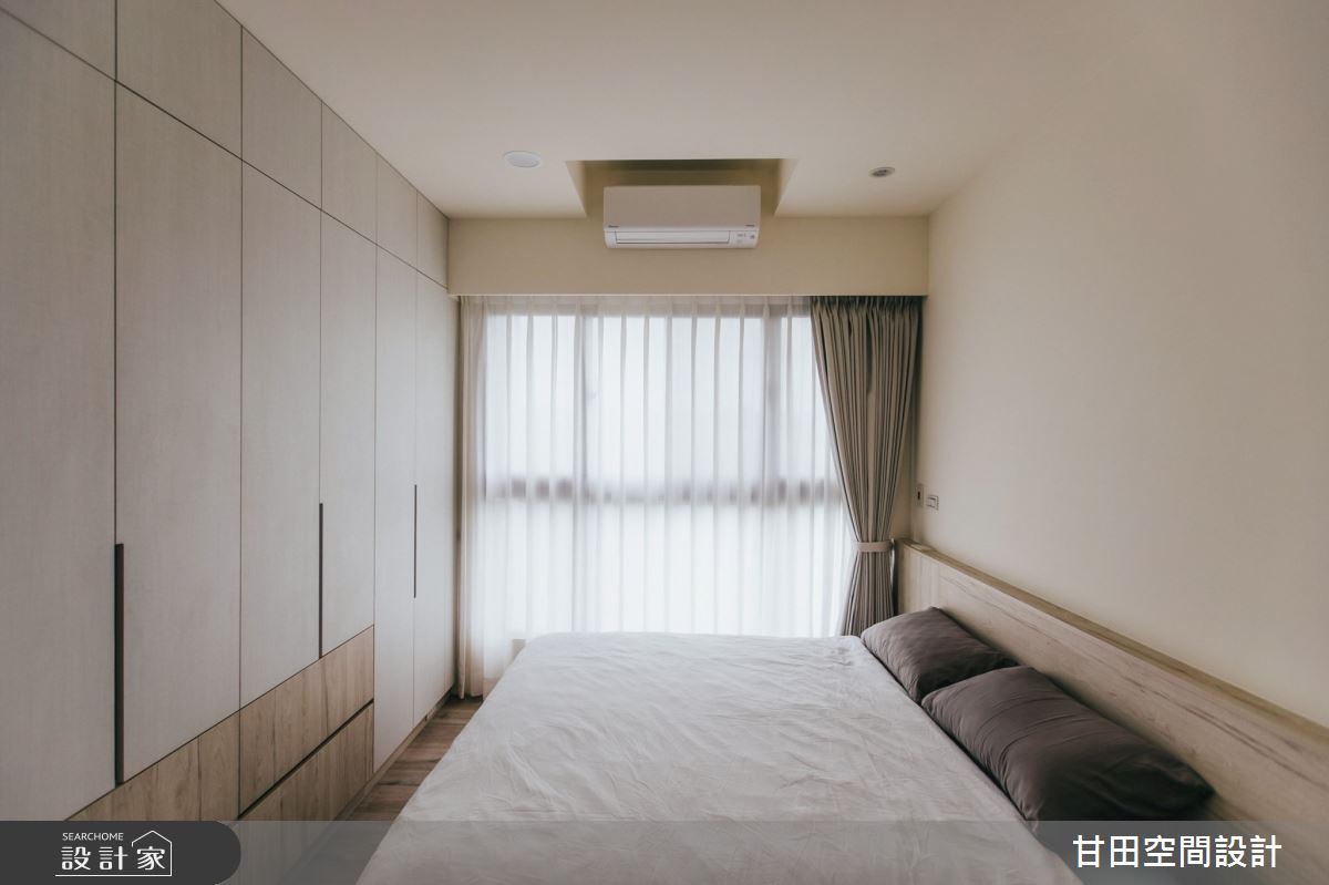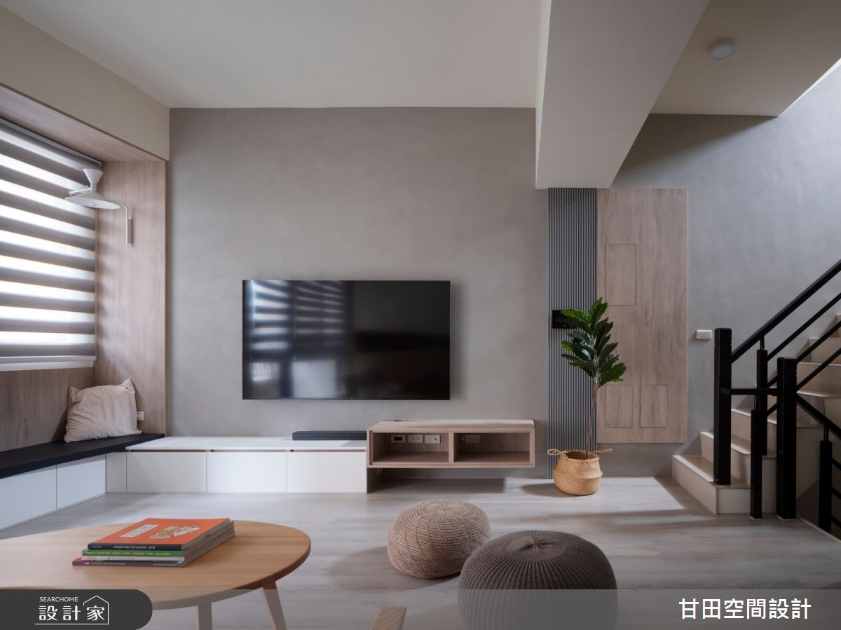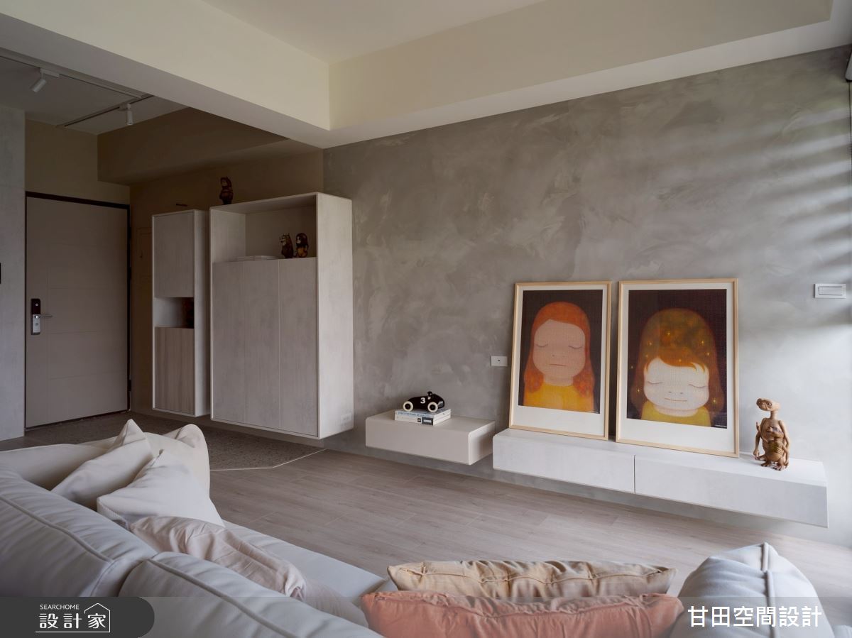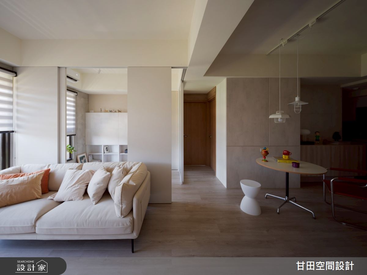 甘田空間設計以乳膠漆、超耐磨木地板、木地板、灰鏡、烤漆、繃布、線板、噴漆、系統櫃、木作、鋁框拉門、清水塗料的搭配應用,呈現簡約風居家氛圍,將此間22坪、三房、單層、新成屋(5年以下)打造成舒適愜意的家庭空間,完成2位大人、1位小孩全家人的夢想之居。