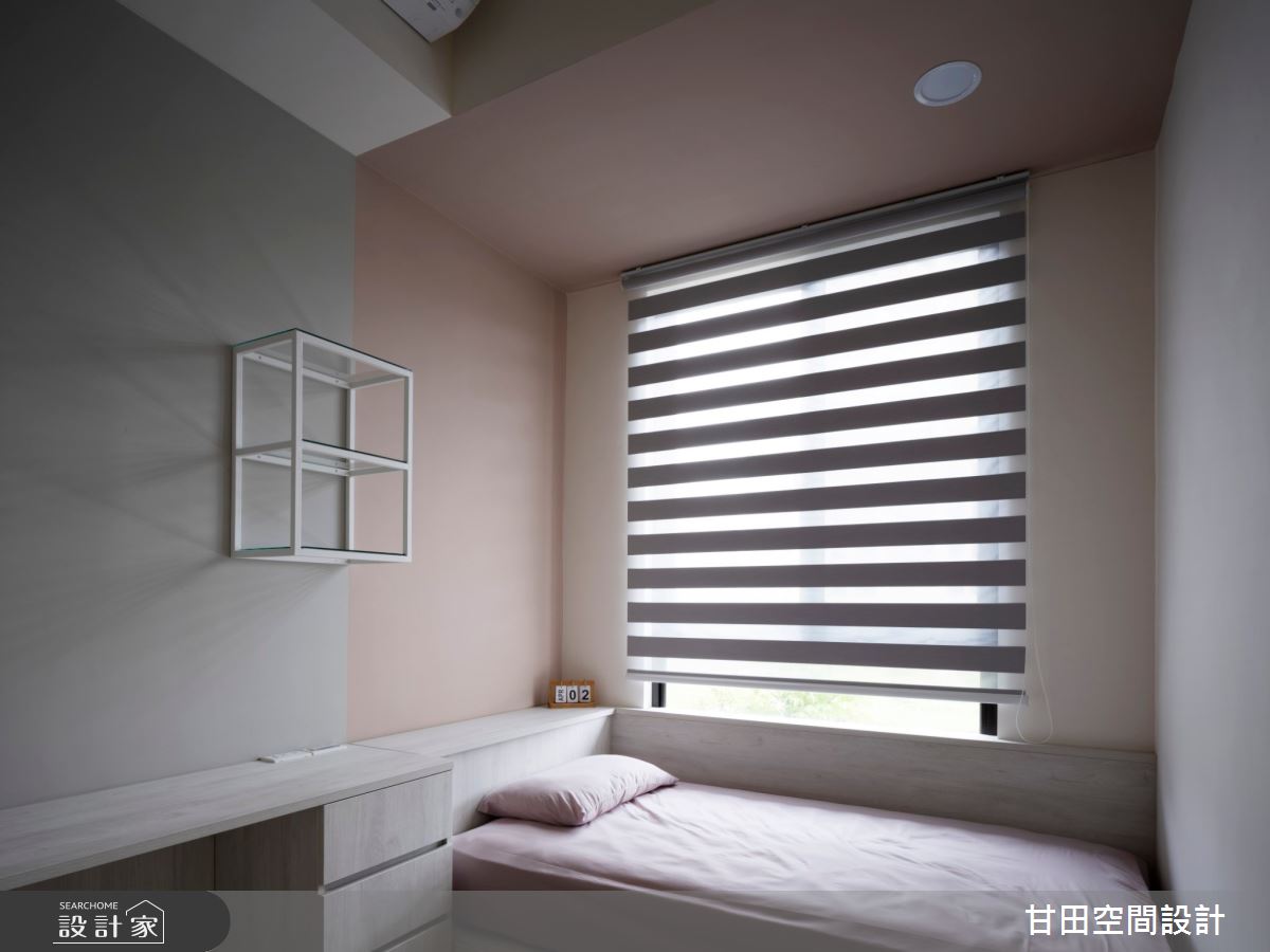 甘田空間設計以油漆、乳膠漆、超耐磨木地板、鐵件、系統板材、木百葉、人造石、軌道燈、仿清水模塗料的搭配應用,呈現現代風居家氛圍,將此間32坪、四房、單層、新成屋(5年以下)打造成舒適愜意的家庭空間,完成2位大人、2位小孩、1位長輩全家人的夢想之居。