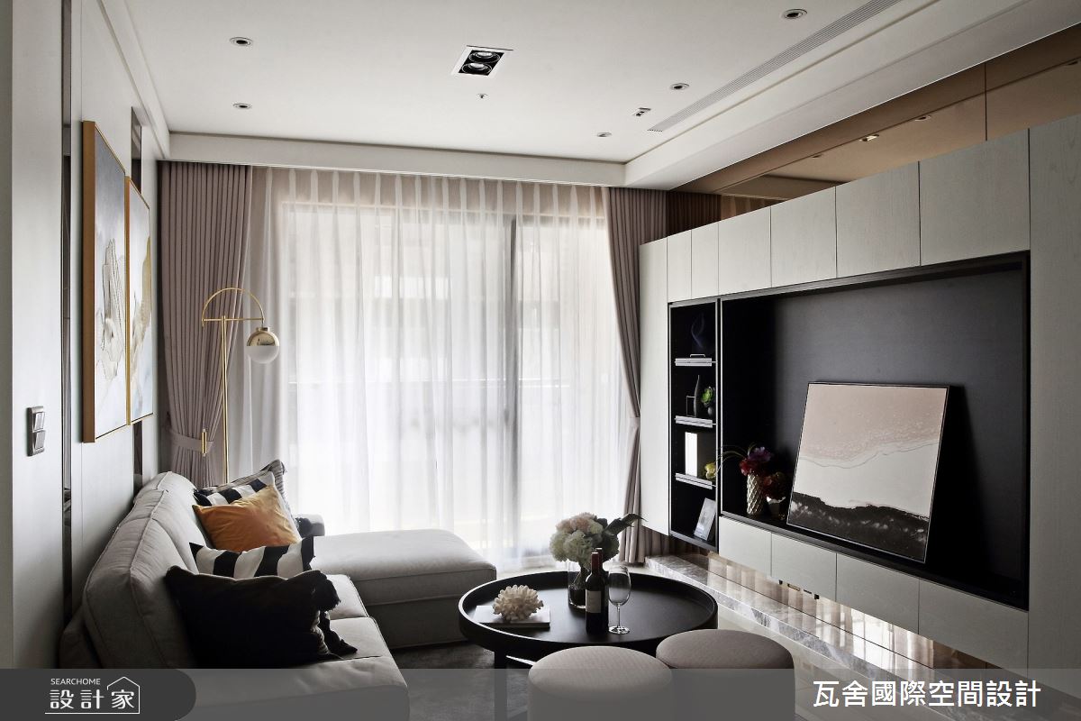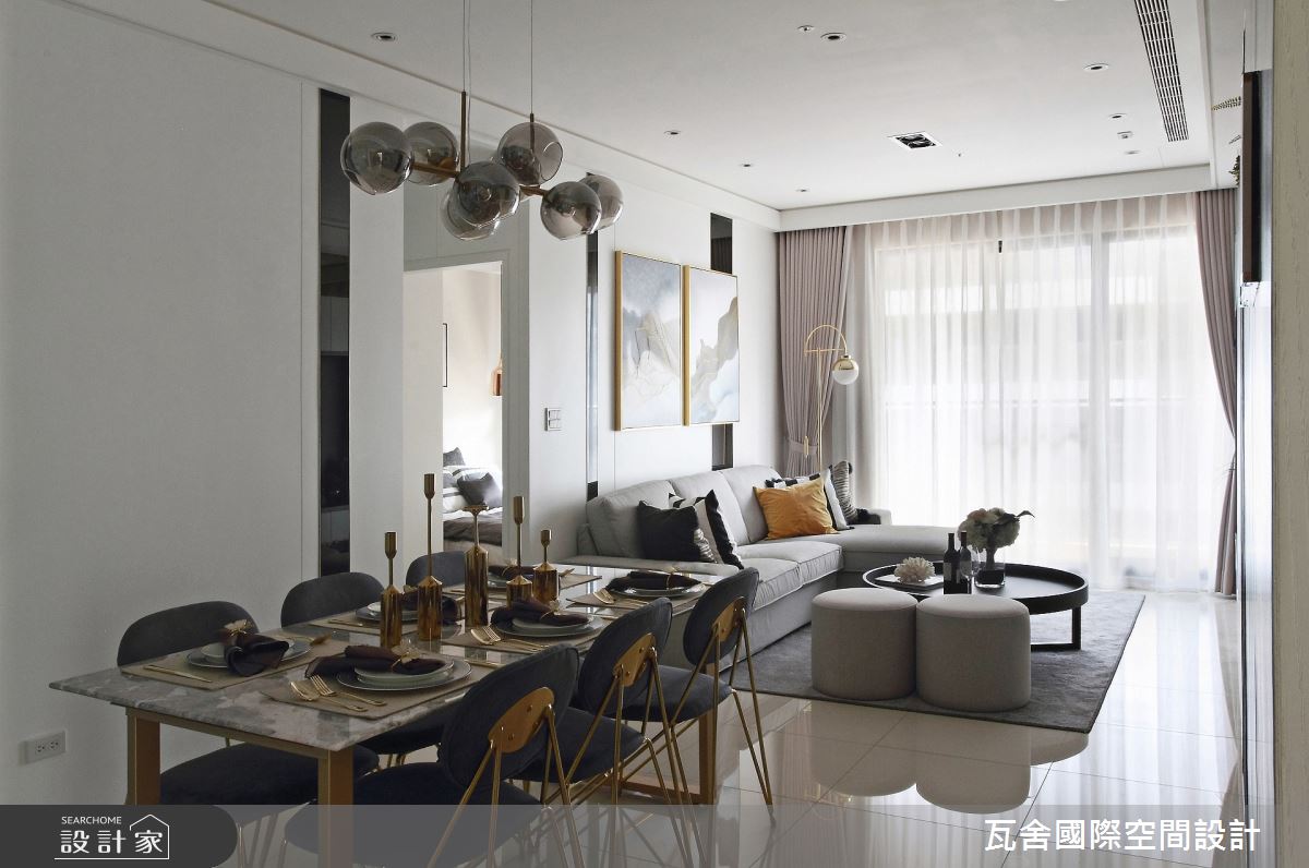 瓦舍國際空間設計以油漆、壁紙、水泥漆、石英磚/拋光石英磚、鐵件、茶玻、烤玻、鍍鈦金屬、木作貼皮、烤漆、鋼刷木皮、大理石、皮革、石材、線板、噴漆、噴砂玻璃的搭配應用,呈現現代風居家氛圍,將此間62.65坪、兩房、單層、毛胚屋打造成舒適愜意的家庭空間,完成全家人的夢想之居。