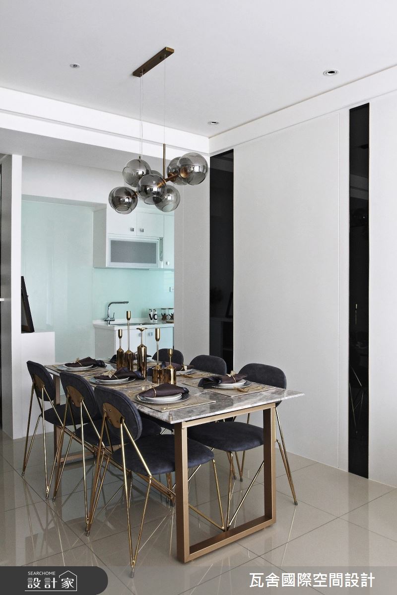來自瓦舍國際空間設計的25坪新古典住宅案,是一間毛胚屋的兩房格局,設計師藉由建材以壁紙、水泥漆、鍍鈦金屬、木作貼皮、烤漆、大理石、石材、線板、噴漆、噴砂玻璃的搭配應用,實現一家人的理想生活。