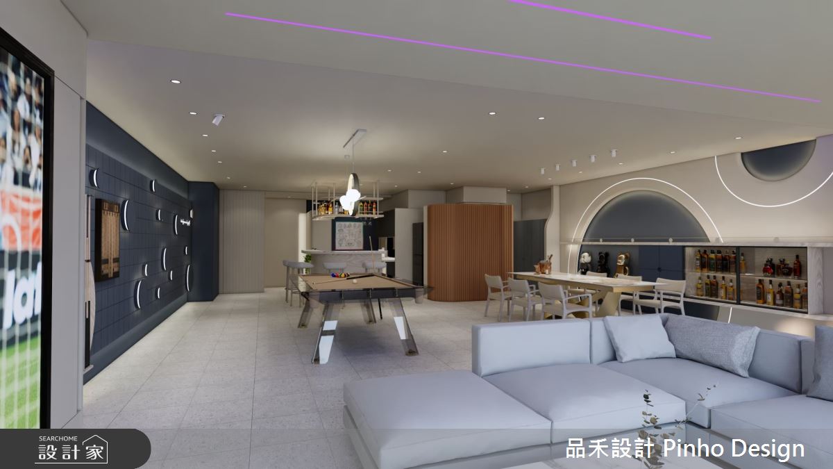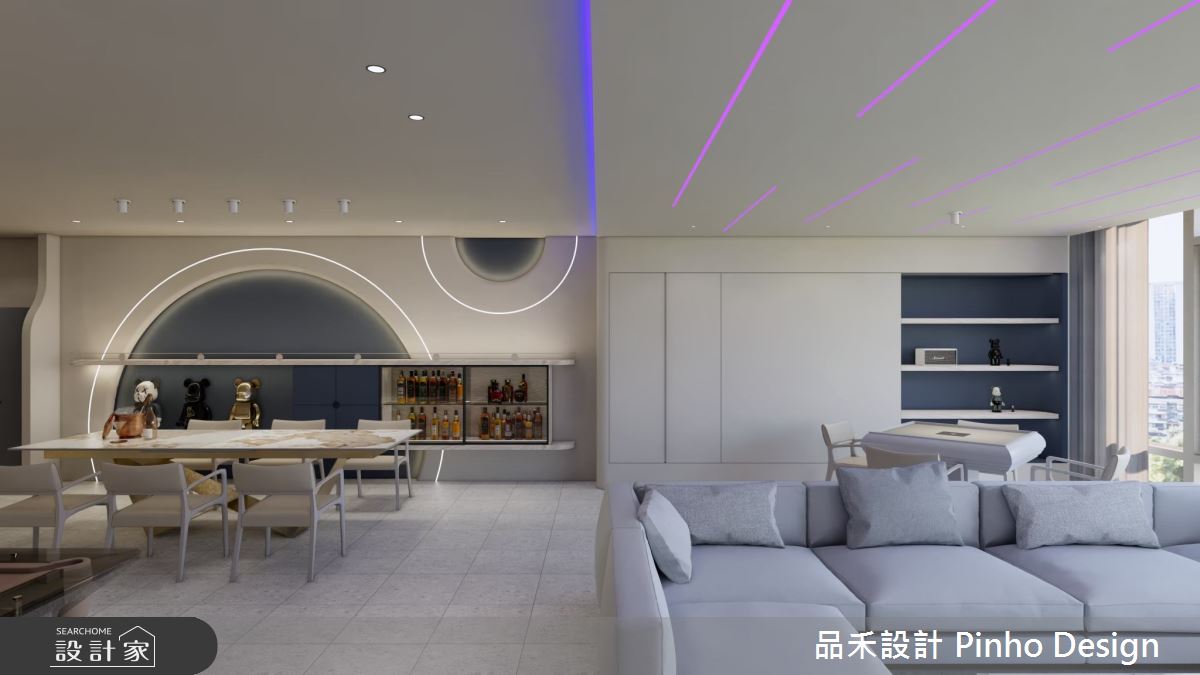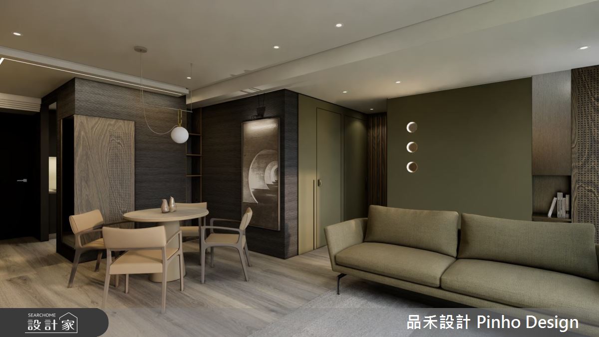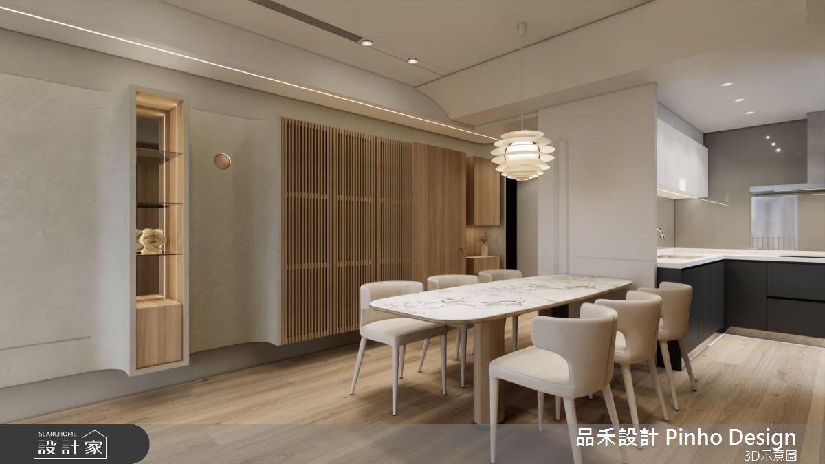 品禾設計以鐵件、大理石、磁磚、藝術塗料、鍍鈦板、彎曲玻璃、手工木皮的搭配應用,呈現輕奢風居家氛圍,將此間60坪、四房、單層、新成屋(5年以下)打造成舒適愜意的家庭空間,完成全家人的夢想之居。