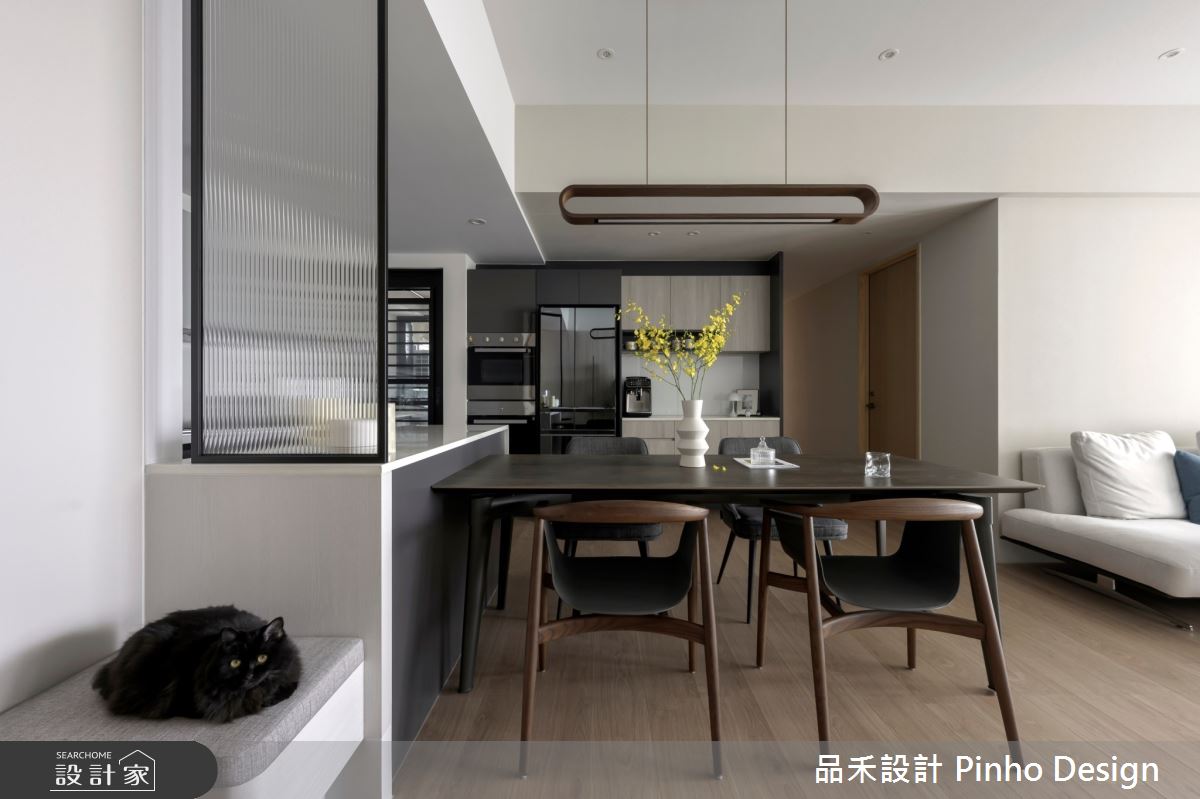 品禾設計以木質、鐵件、藝術塗料、玻璃的搭配應用,呈現簡約風居家氛圍,將此間40坪、三房、單層、新成屋(5年以下)打造成舒適愜意的家庭空間,完成2位大人全家人的夢想之居。