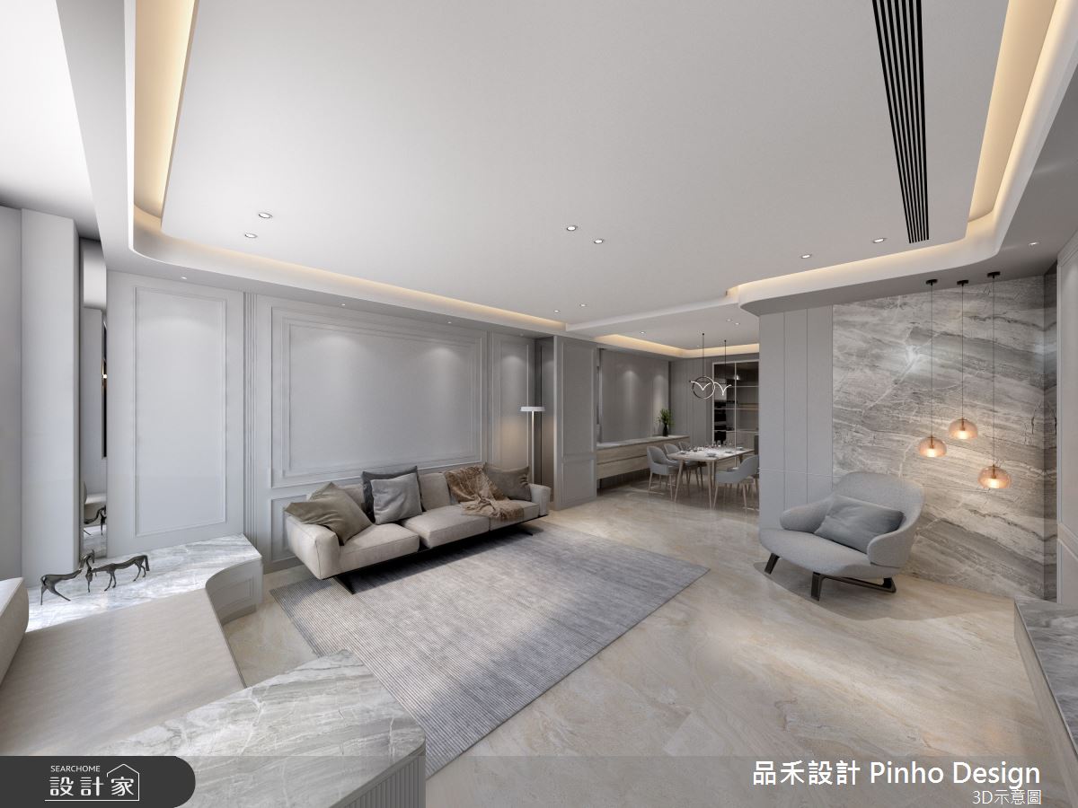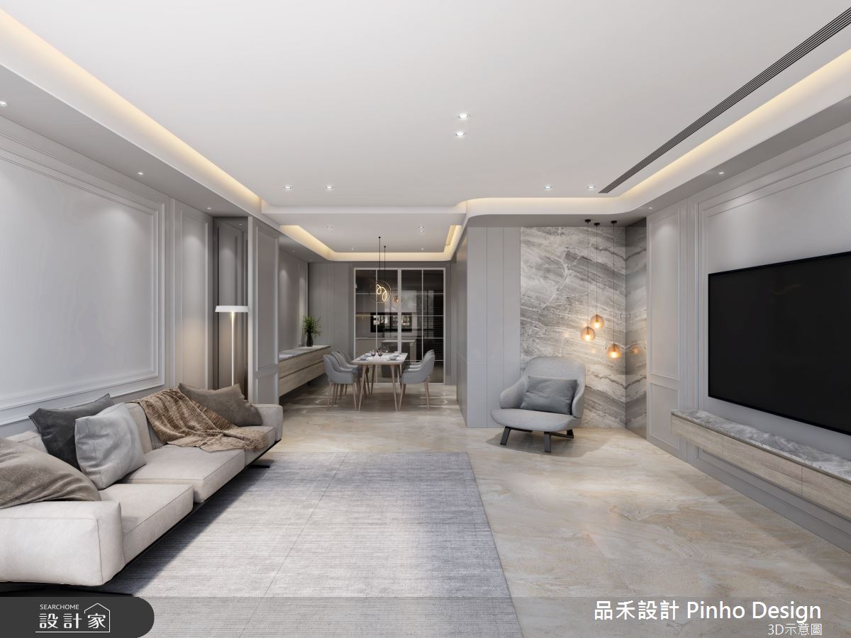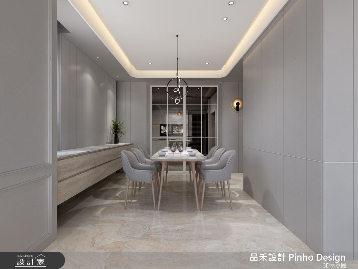 來自品禾設計 Pinho Design的80坪美式風住宅案,是一間透天別墅新成屋(5年以下)的五房格局,設計師藉由建材以乳膠漆、不鏽鋼、鐵件、灰鏡、茶玻、鍍鈦金屬、木作貼皮、大理石、木百葉、繃布、線板的搭配應用,實現一家人的理想生活。