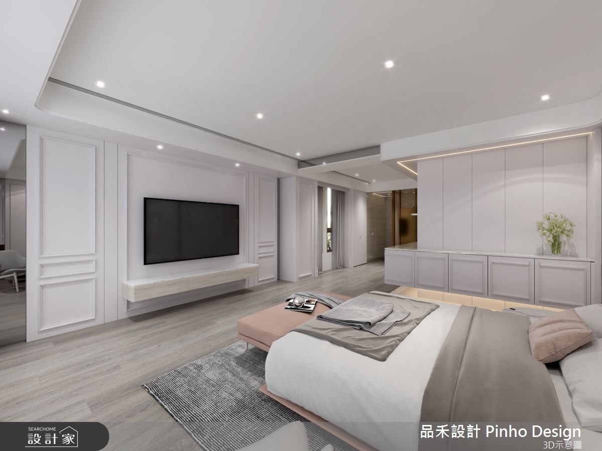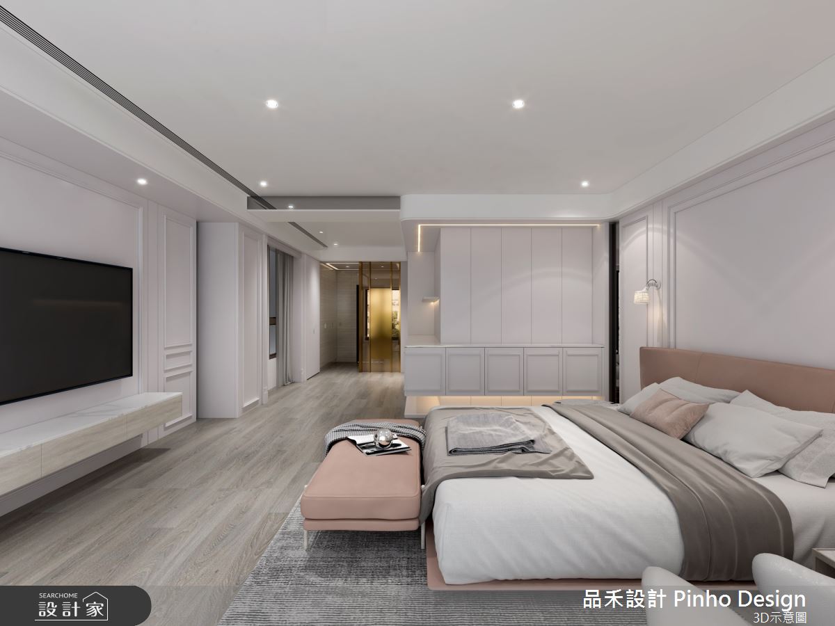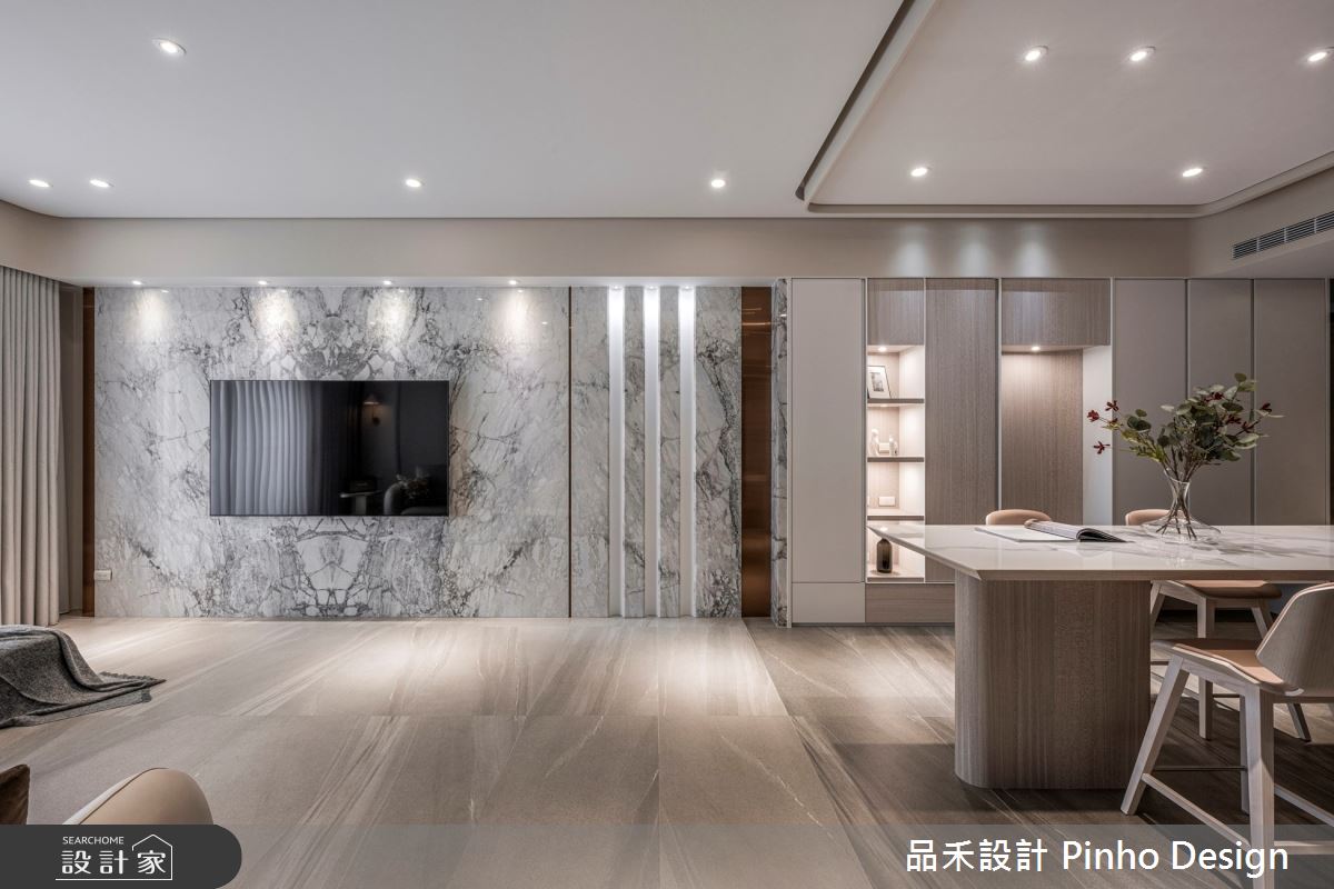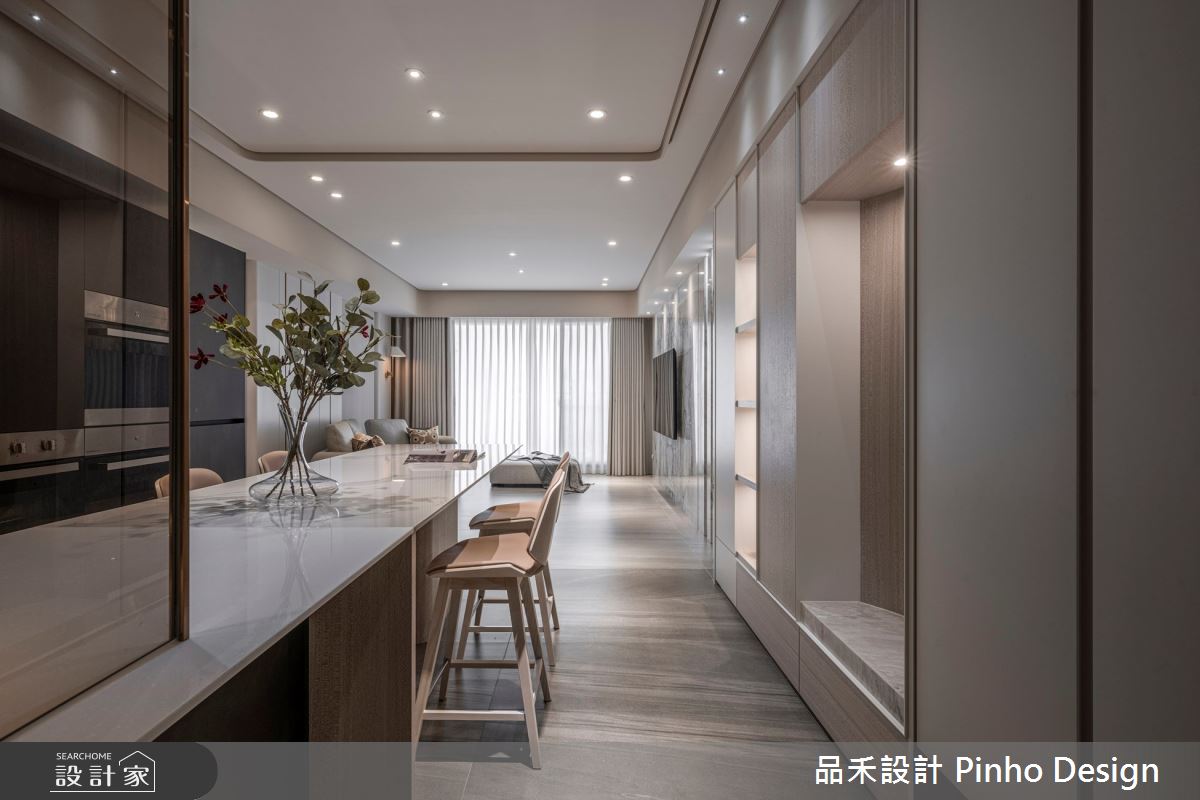 來自品禾設計 Pinho Design的80坪美式風住宅案,是一間透天別墅新成屋(5年以下)的五房格局,設計師藉由建材以乳膠漆、不鏽鋼、鐵件、灰鏡、茶玻、鍍鈦金屬、木作貼皮、大理石、木百葉、繃布、線板的搭配應用,實現一家人的理想生活。