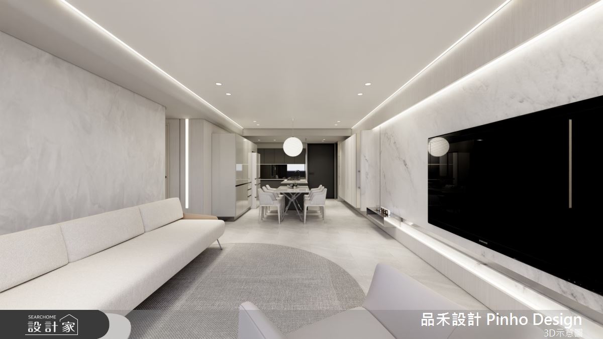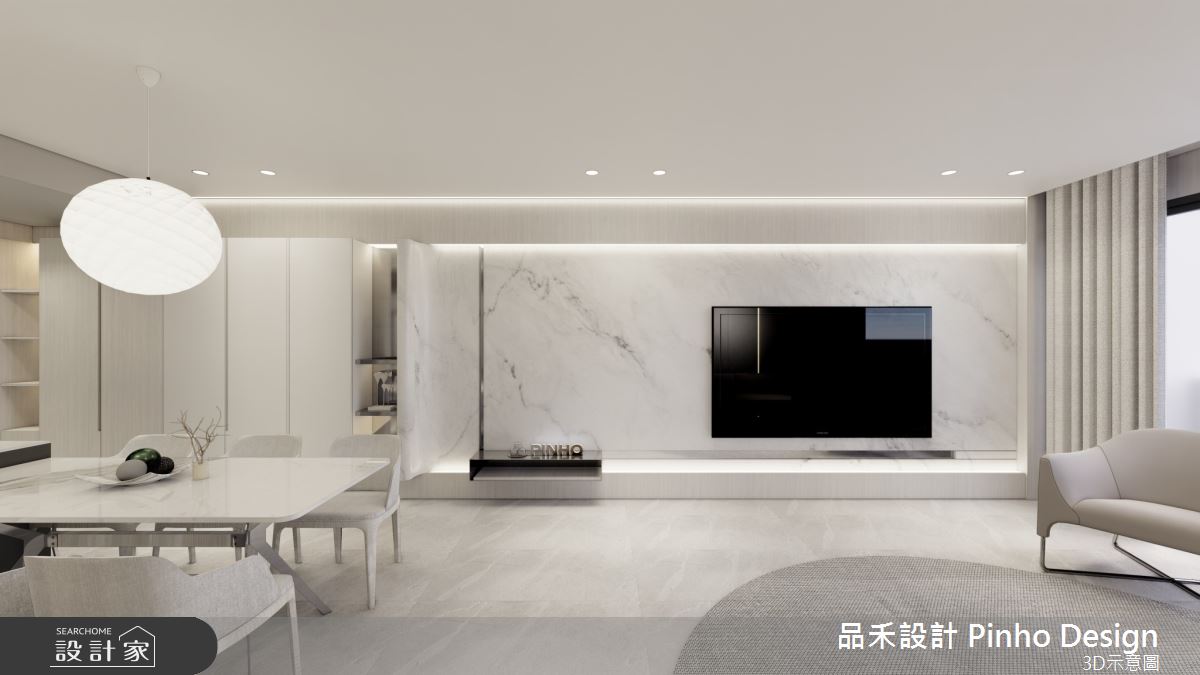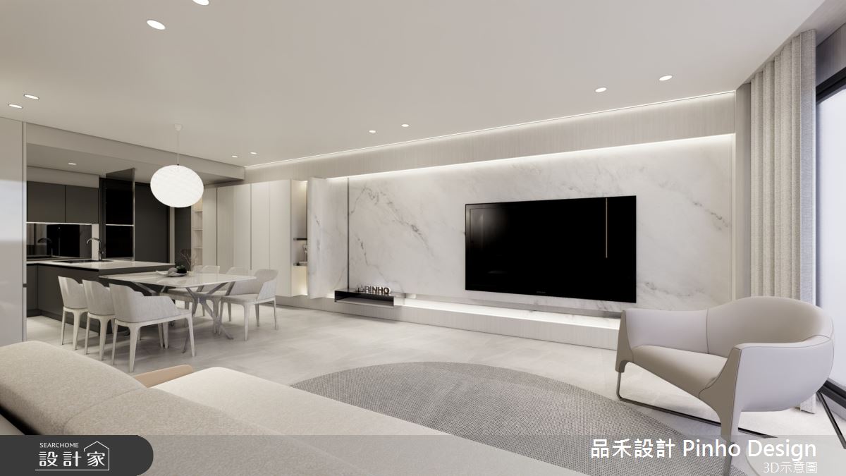 品禾設計以鐵件、大理石、磁磚、藝術塗料、鍍鈦板、彎曲玻璃、手工木皮的搭配應用,呈現輕奢風居家氛圍,將此間60坪、四房、單層、新成屋(5年以下)打造成舒適愜意的家庭空間,完成全家人的夢想之居。