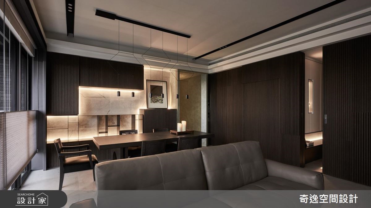 打破制式的格局設定,以開闊的動線串連客廳與多功能餐廳,為爸媽和孩子打造友善無礙的親子空間。 有鑑於優良採光,設計師將客廳空間比例放大,直接以沙發作為場域分隔,沙發創造的回字動線客、餐廳有著暢通的行徑動線。走道另一側有著細緻格柵造型的拉門後方,依序分布兼具書房機能的次臥以及獨立廚房,可隨需求任意分配拉門位置,適時獲得休憩、閱讀的隱私或在烹飪時防止油煙逸散。針對材質選擇,電視主牆與餐廳背牆的大理石紋理相互呼應,搭配沉穩的木質色調,營造自然不失大器的氣息。燈光設計也不馬虎,餐廳利用特殊造型燈飾搭配間接照明,營造溫馨的用餐氛圍;走廊則使用洗牆手法,打造宛如身處藝廊的高級質感。 小編的最愛 巧妙運用拉門收整空間場域,將視覺重點放在開放式客、餐廳,搭配大面優良採光,營造悠閒不失質感的居家感受。