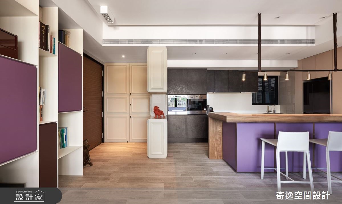 34 坪混搭宅,除了坐擁美好景觀之外,設計師亦透過材質與色彩規劃,經由牆面設計帶出多變感受,造就每個場域的主題焦點,型構出舒適且美觀的住宅內涵,快跟著小編一起來看看吧! 步入居宅,可見玄關的柔和白色基底,帶來入門後的放鬆氛圍,並藉由線板點綴提升優雅氣質、豐富視覺層次感,且運用櫃體區劃與餐廚之間位置,引用靈活色調與面材建構廚房領域,在塊體、立面的交互穿插之下,凝聚活潑的場景畫面;客廳則將電視、書櫃、收納等集結為一體,打造多元機能電視牆,結合錯落的櫃體分割,讓立面樣貌更形活潑,沙發牆以木質鋪述背景,再巧妙於上方保留透空,瓦解牆體的厚重封閉感,搭襯著皮質沙發及同色系裱框畫作,勾勒生動的牆面風貌;主臥以音響取代電視,打造低調華麗的牆面表情,加以回字動線串聯睡眠區與衛浴,型塑流暢起居動線,並採用透明玻璃區隔主衛,創造通透擴大感,成就獨特的空間視野! 小編的最愛 寢臥搭佐金色邊框修飾,帶入歐風古典氣息,並巧妙在牆面周邊融入圓弧導角,給予柱體及牆面的雙重象徵,替臥房注入宮廷般的古典想像!