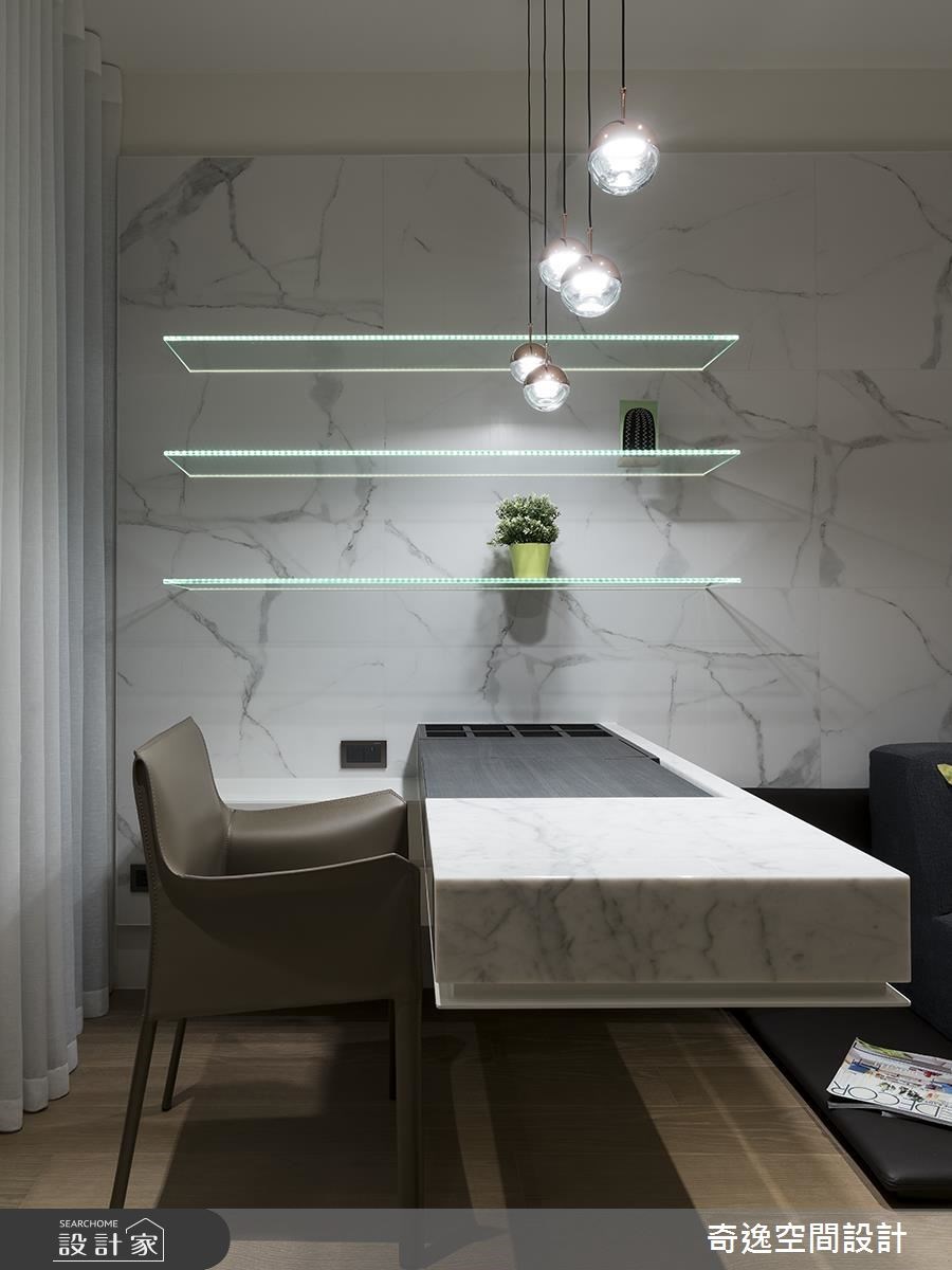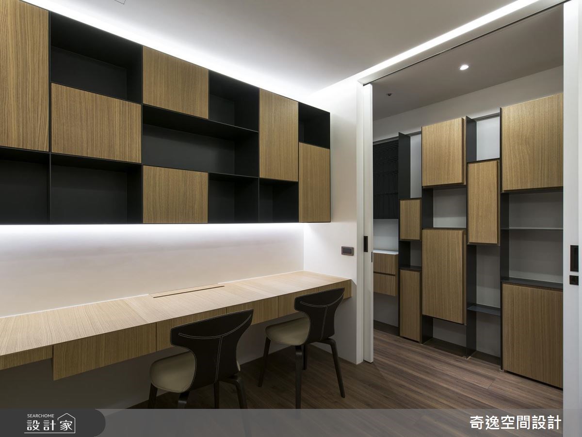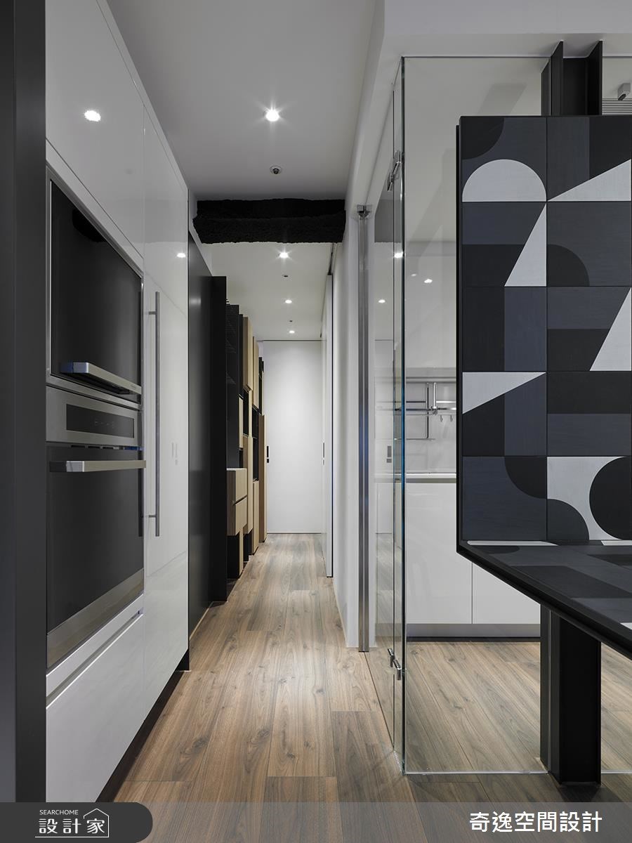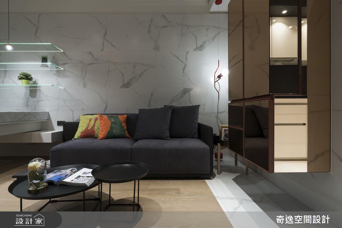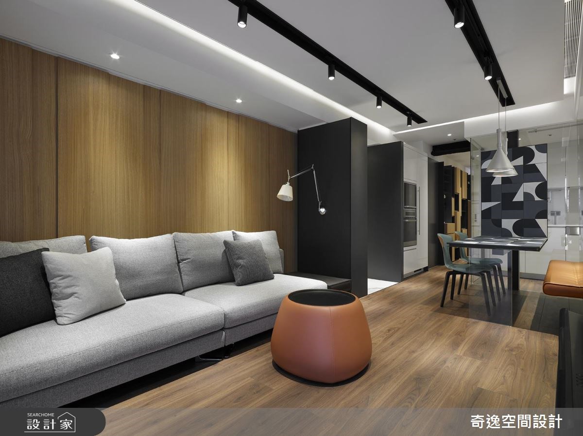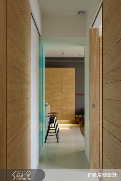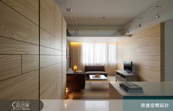 位於首都市中心的新建案日日田町周遭機能非常完善,主打適合新婚夫妻的小坪數居住模式,與奇逸空間設計合作,為 9 坪空間規劃雙人居住動線。 由於坪數有限,因此設計師將重點放在收納、空間放大與格局重整,首先利用開放設計串連整個空間,再依序將公私領域放置在前後端。建商將玄關與一字型廚房結合,設計師在另一側加入櫃體與面鏡同時完整收納、整裝用途。公領域結合書房與客廳機能,巧妙應用木地板做出內外場域分野,由於考慮到新婚族預算有限,特別使用帶有大理石紋路的美耐板鋪陳於牆面,並與懸空書桌一體成形,打造俐落、大器的居家感受。為了讓小空間內的視覺更顯輕盈,收納櫃體與層板不僅為懸空設計,更巧用發光玻璃建材與金屬感鏡面彰顯前衛感。 小編的最愛 由於空間有限,因此設計師結合了拉門門片與電視牆,不僅減省了開門占用的空間,更能達成多元複合機能,黑色木紋牆面更為空間增添沉穩魅力。