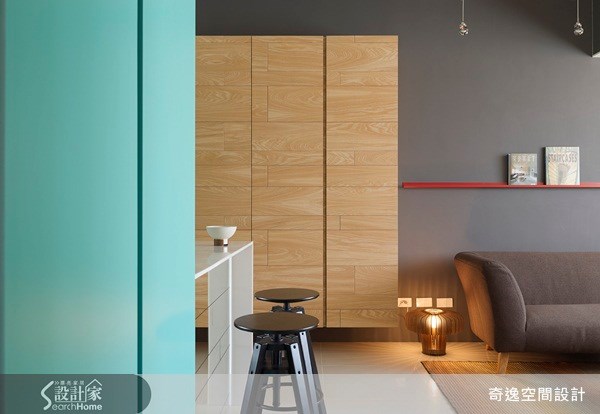 本案屋主為一藝術工作,希望能將喜愛的普普風畫作納入設計,於是設計師將帶點普普風感覺的壁紙用在主臥室,創造一種少有的復古風格。同時因屋主較能接受大膽的顏色,因此將色彩大膽的運用至沙發背強牆面及廚具上,呈現強烈的視覺風格,產生現代與復古的同時並存,但卻又巧妙的融合在空間中,讓人百看不膩。裝修費用:101~199萬。