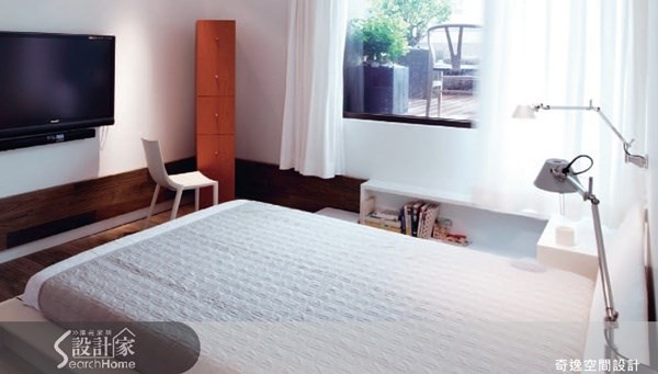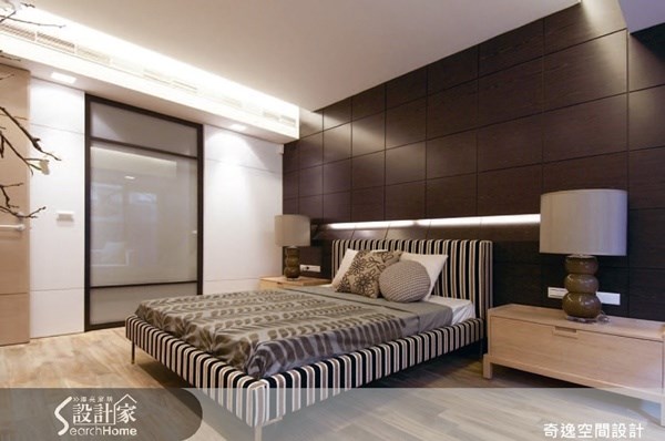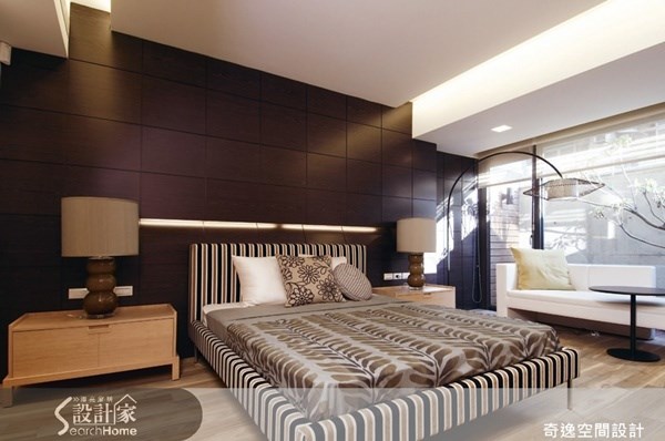 <多重光源的巧妙設計> 主臥室具有大面積的落地窗,可援引舒適的自然光源,而透過戶外造景以及清水模牆面,也為空間空間帶來些許日式禪風韻味。除此之外天花板的凹槽藏有間接燈光,床頭也以摺線斜向的開口內藏燈光。多重光源的設計為空間空間光線帶來豐富
