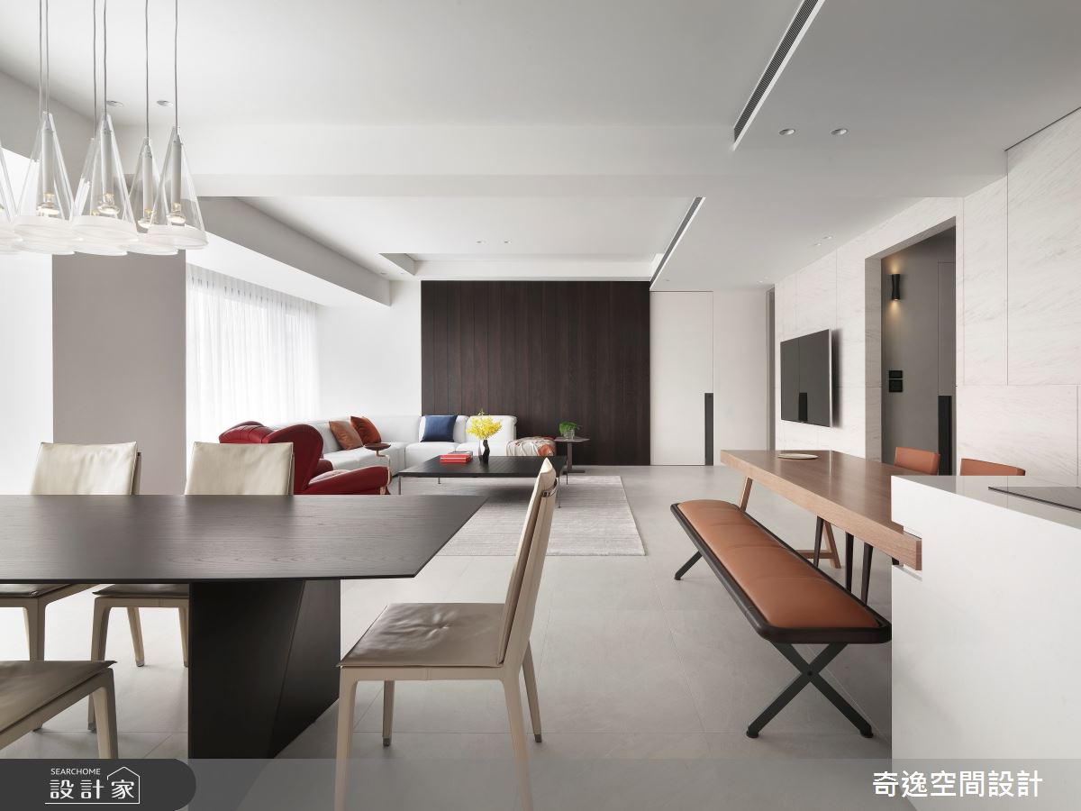 奇逸空間設計以乳膠漆、海島型木地板、鐵件、茶玻、木作貼皮、烤漆、系統板材、大理石、磁磚、皮革、石材、噴漆的搭配應用,呈現現代風居家氛圍,將此間55坪、三房、單層、新成屋(5年以下)打造成舒適愜意的家庭空間,完成2位大人、2位小孩全家人的夢想之居。