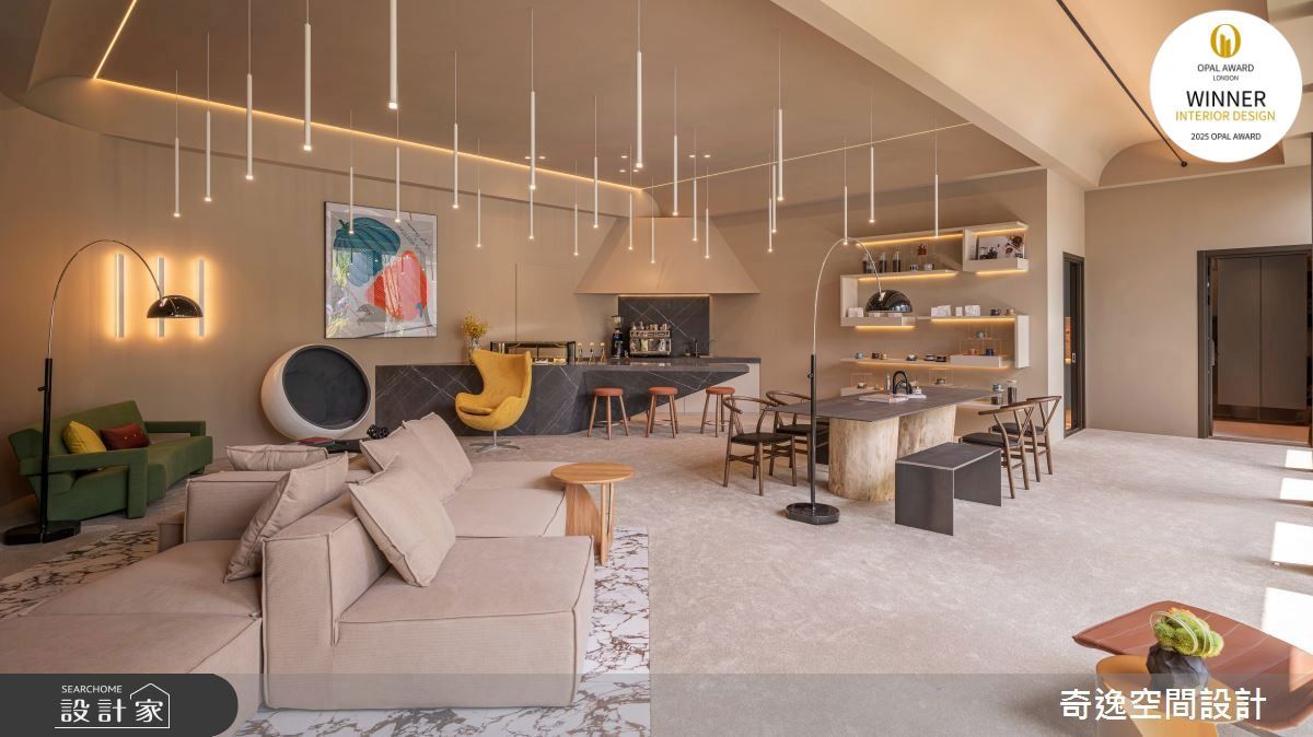 奇逸空間設計以油漆、海島型木地板、石英磚/拋光石英磚、不鏽鋼、鐵件、鍍鈦金屬、大理石、磁磚、皮革、石材、噴漆的搭配應用,呈現現代風的風格氣息,將此間80坪毛胚屋優雅詮釋成舒適愜意的公共空間。