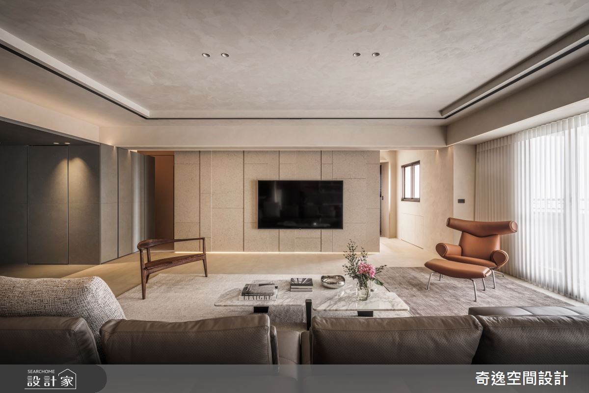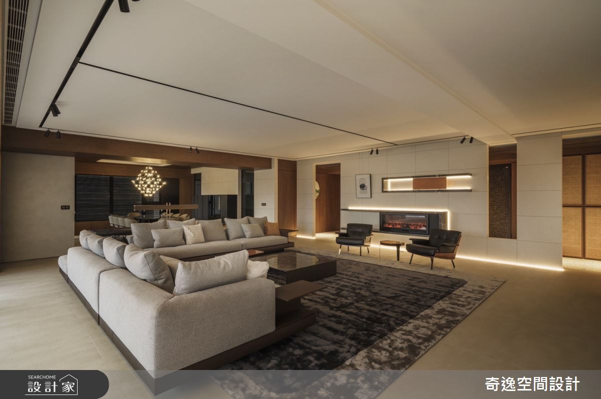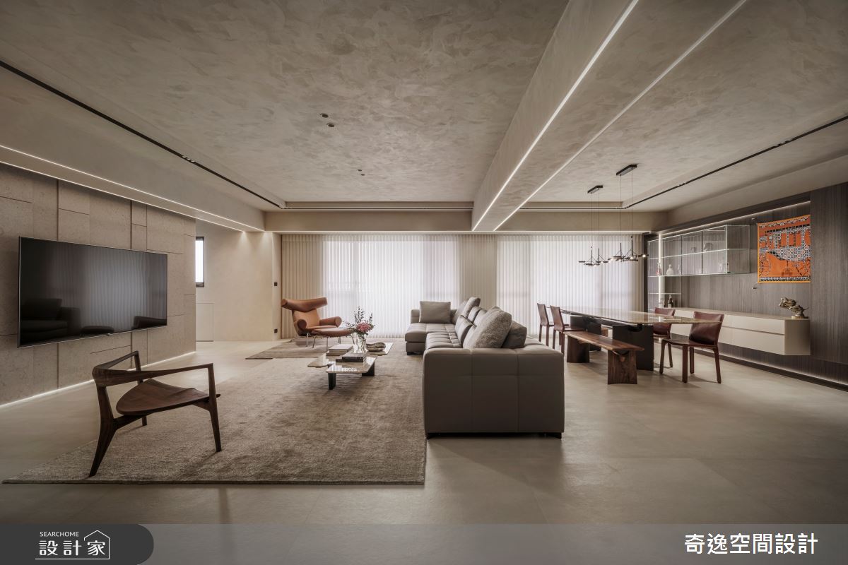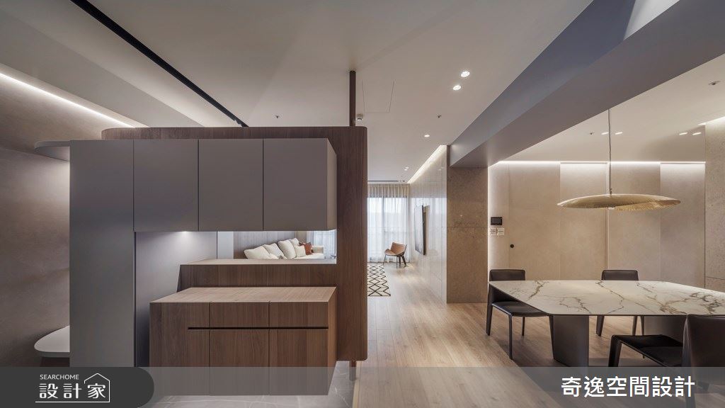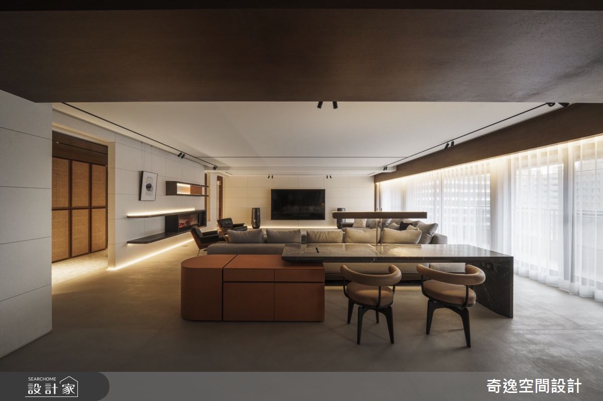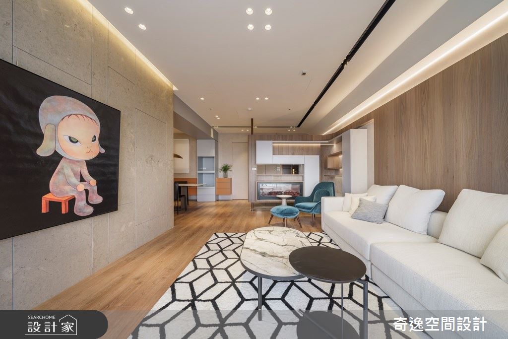 奇逸空間設計以乳膠漆、海島型木地板、鐵件、茶玻、木作貼皮、烤漆、系統板材、大理石、磁磚、皮革、石材、噴漆的搭配應用,呈現現代風居家氛圍,將此間55坪、三房、單層、新成屋(5年以下)打造成舒適愜意的家庭空間,完成2位大人、2位小孩全家人的夢想之居。