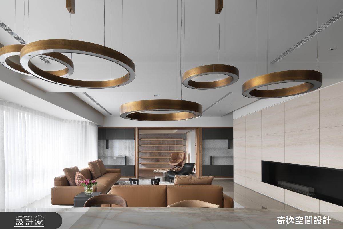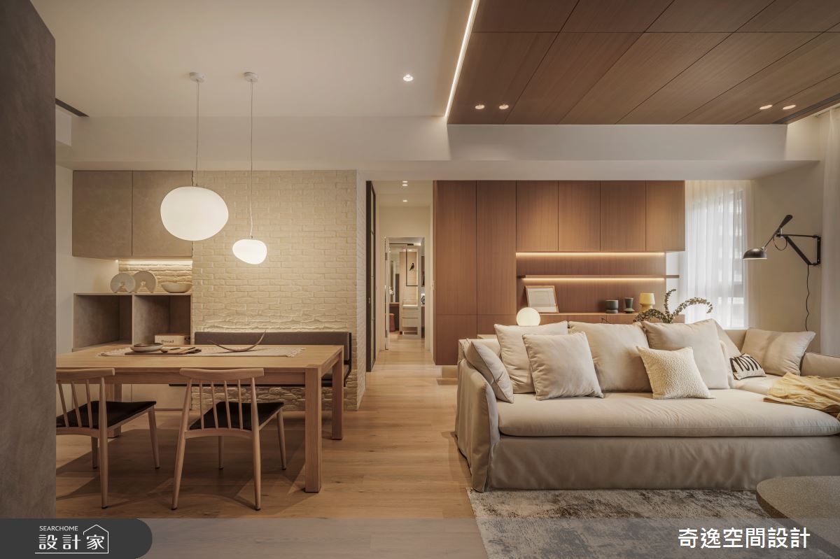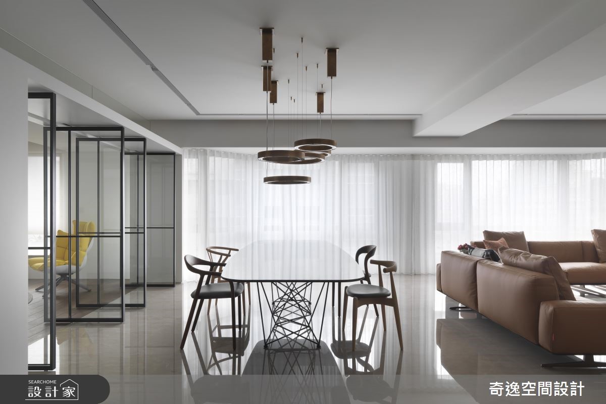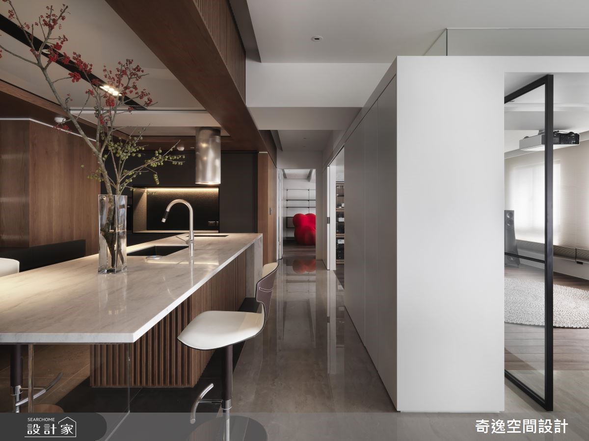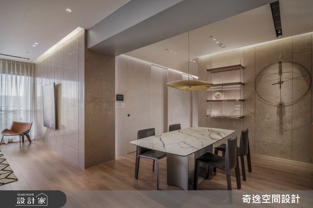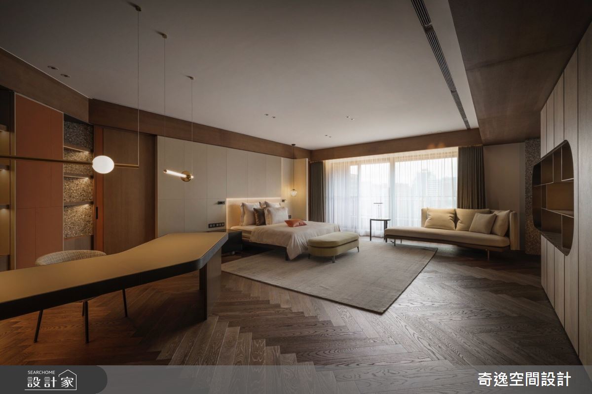 奇逸空間設計以乳膠漆、海島型木地板、鐵件、茶玻、木作貼皮、烤漆、系統板材、大理石、磁磚、皮革、石材、噴漆的搭配應用,呈現現代風居家氛圍,將此間55坪、三房、單層、新成屋(5年以下)打造成舒適愜意的家庭空間,完成2位大人、2位小孩全家人的夢想之居。