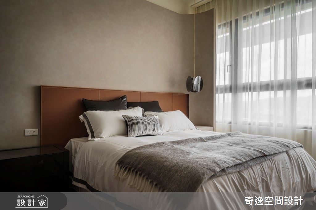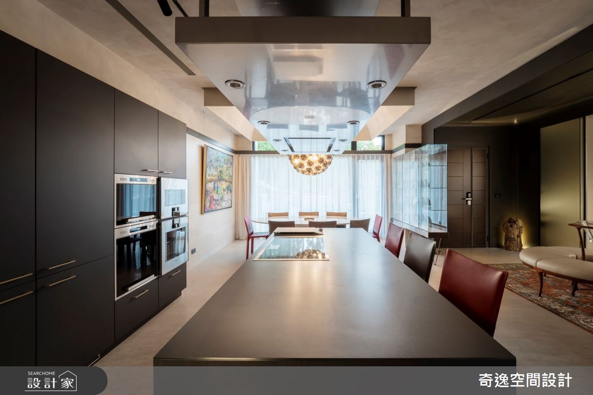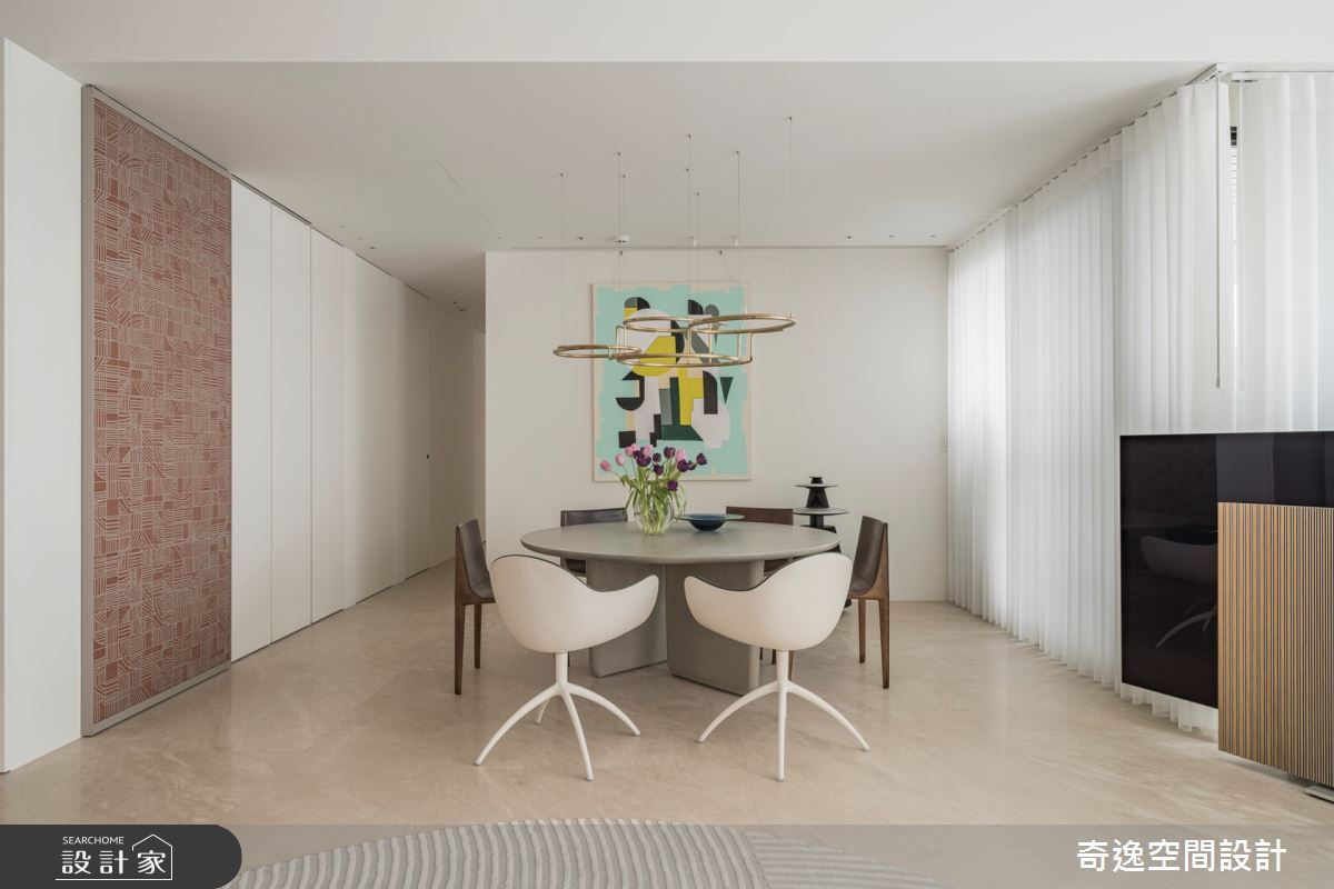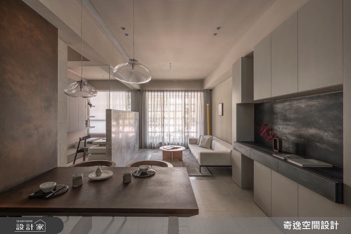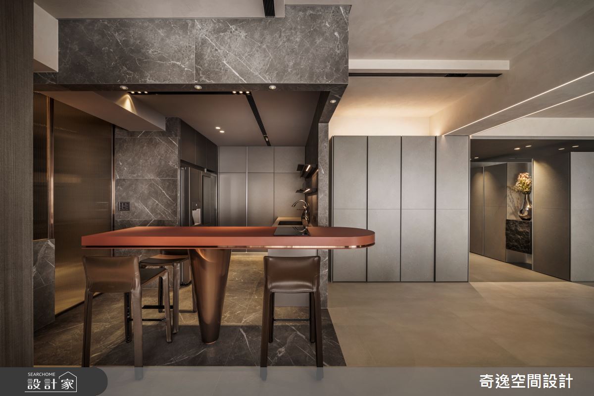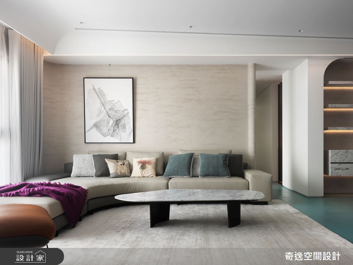 奇逸空間設計以乳膠漆、海島型木地板、鐵件、茶玻、木作貼皮、烤漆、系統板材、大理石、磁磚、皮革、石材、噴漆的搭配應用,呈現現代風居家氛圍,將此間55坪、三房、單層、新成屋(5年以下)打造成舒適愜意的家庭空間,完成2位大人、2位小孩全家人的夢想之居。
