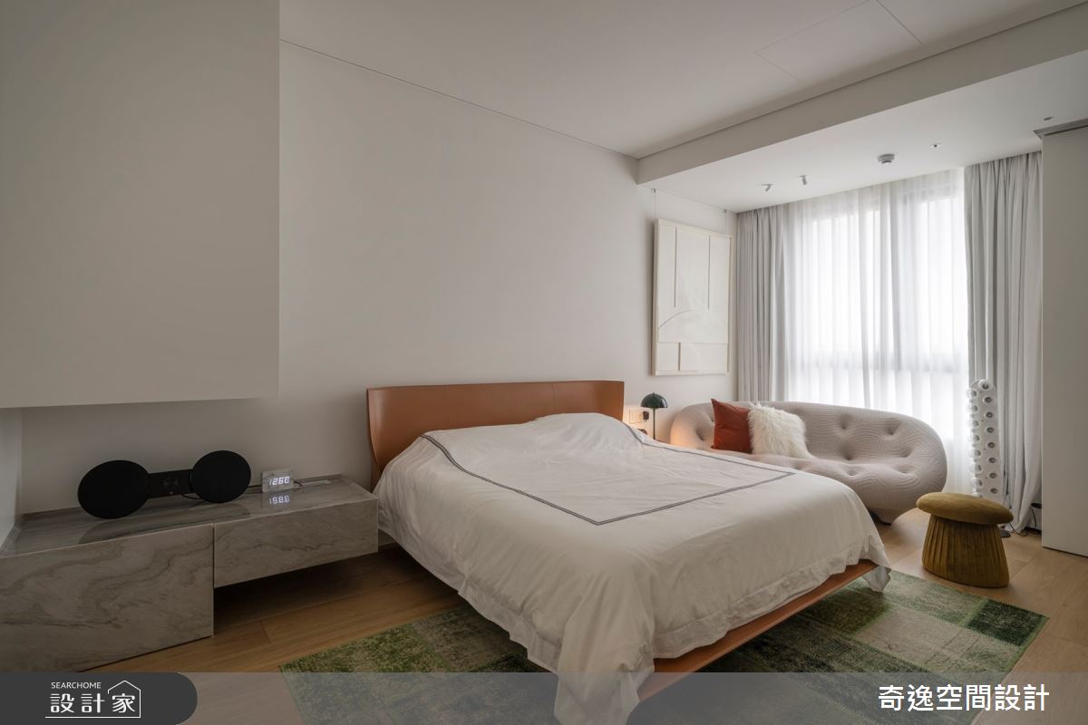 奇逸空間設計以油漆、乳膠漆、超耐磨木地板、石英磚/拋光石英磚、鐵件、木作貼皮、烤漆、系統板材、大理石、磁磚、皮革、石材、繃布、噴漆的搭配應用,呈現現代風居家氛圍,將此間40坪、三房、單層、新成屋(5年以下)打造成舒適愜意的家庭空間,完成2位大人、2位小孩全家人的夢想之居。