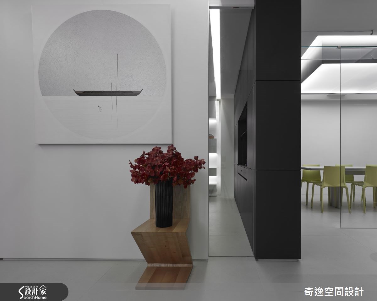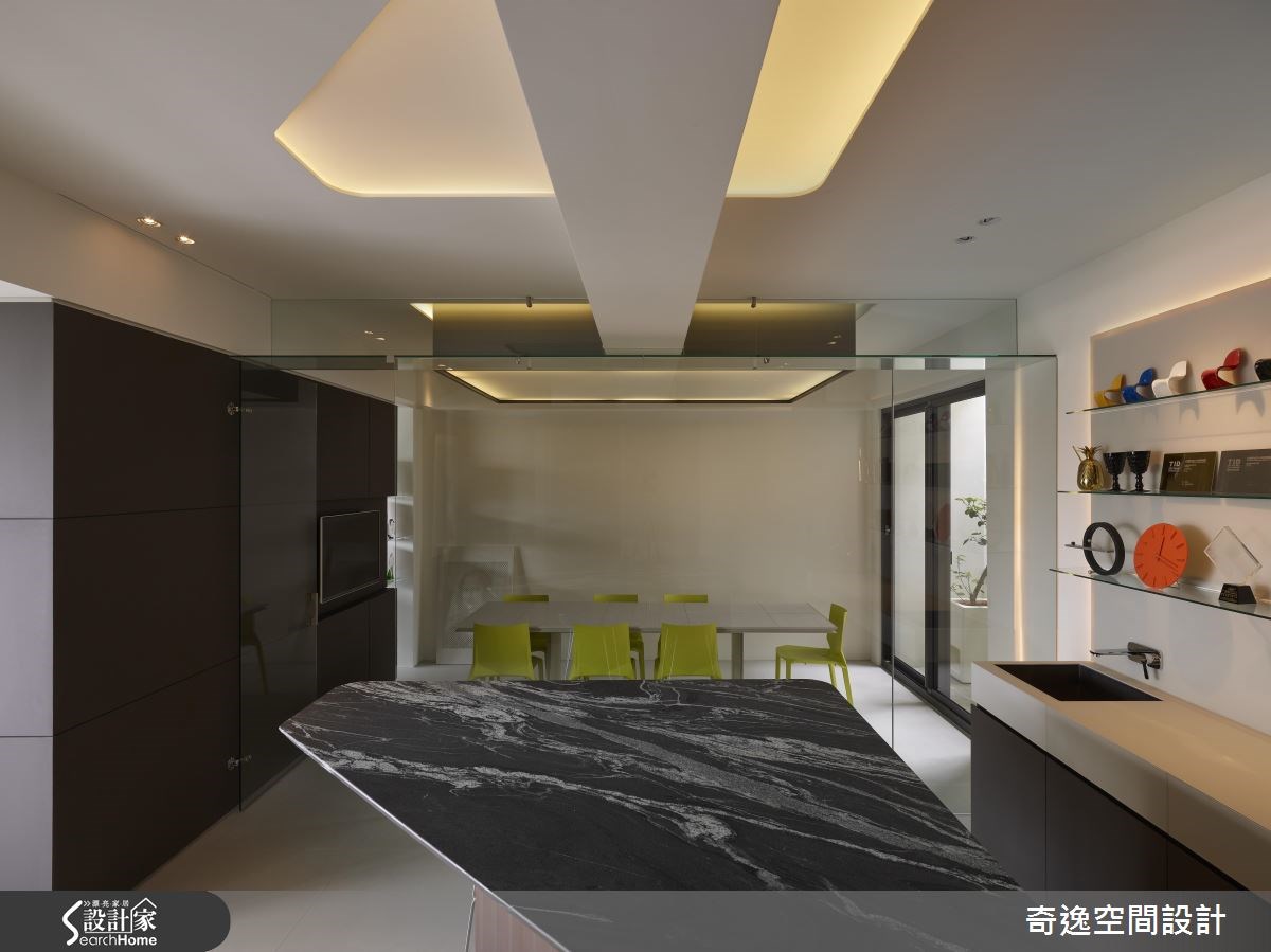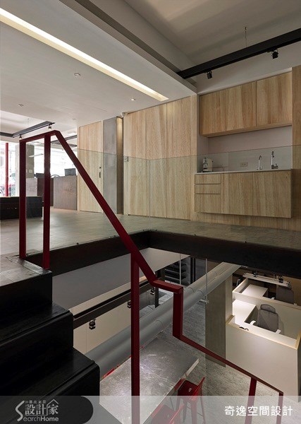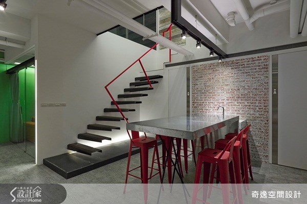 31.5 坪老屋,是奇逸空間設計團隊的商辦場域,設計師規劃自家辦公室,想必更能確切掌握各項機能與格局;首先沿用空間的 13 米窗面,創造豐富多變的景觀,給予混搭風挹注,創造美感不設限的創意環境,讓員工更能激發工作潛力,快跟著小編一起來看看吧! 大門處,設計師以深灰布紋磚鋪陳壁面、建構專業印象,運用漸層紋理創造視覺層次,形成由外向內的動線導引;走進室內,則可見不規則切割的花崗石桌檯,作為接待、會議與休憩的多功能區域,樑體則自然橫亙於天花,有如後現代的藝術雕塑品,再透過多彩的裝飾品及軟件陳設,開啟繽紛活潑的愉悅情境;同時藉由既有景觀優勢,將長型會議桌安排在此,以綠意、採光營造紓壓感,幫助團隊激發更多創意火花,而俐落對稱的框線語彙,搭配著輕薄電腦屏幕、帶有未來感的燈光設計等,則演繹出簡潔洗鍊的後現代時尚場景! 小編的最愛 細節處,設計師也毫不馬虎,像是將廁所洗手檯巧思規劃圓弧狀牆面,並採用深色亮面建材引領摩登感,搭配從天降下的造型水龍頭,令人倍感驚豔!