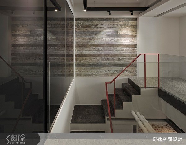 此案設計重點在於在空間內巧妙帶入完成建築所需材料,並在空間呈現出綠建築的概念。例如使用回收木材,裸露柱位,突顯結構感。另於吧台桌腳及會議室層板櫃使用6分鋼筋, 不去修飾,忠於材料原始表情。而門口牆面的建築物圖案線條,也以噴漆漆上綠色,以突顯業主對於綠建築的喜好。步入地下室除了基本的坐位,更加入業主所喜好的空間,有吧台,Playzone等,希望提供員工一個可放鬆的辦公環境。而本案使用材質皆希望呈現材質的原始面貌,而不加工修飾,再加入紅色扶手及綠色牆面帶入色彩,使整體空間樸實但有生氣的面貌。主要建材: 鍍鈦鐵板、大理石、烤漆玻璃。裝修費用: 300~399萬。