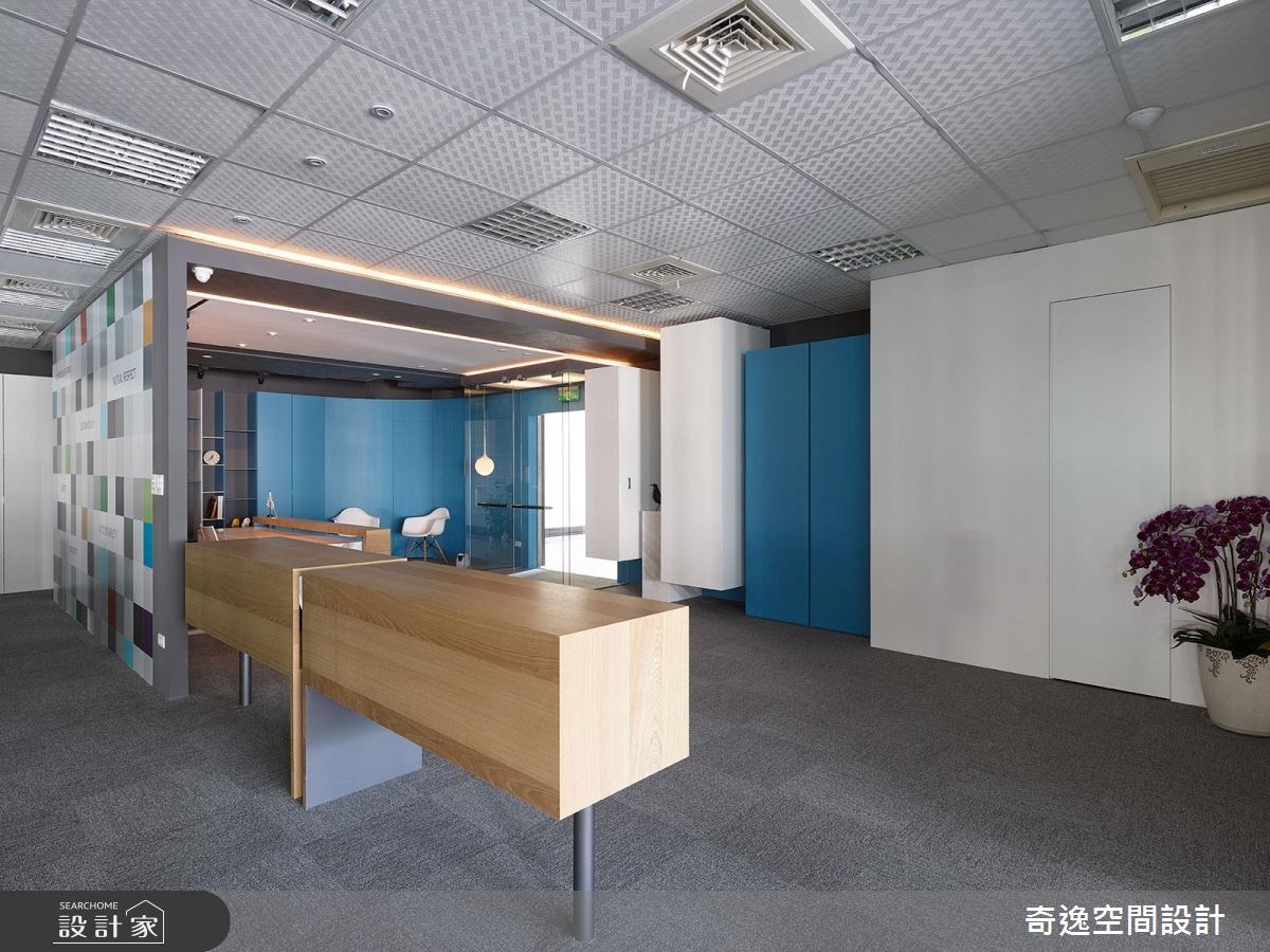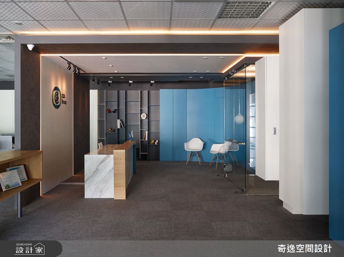34 坪商辦場域,設計師大玩色彩創意,刻意以亮藍、亮綠結合白色,拼湊出豐富的視覺彩度、無形中達成空間延展性,同時融入俐落有型的線條,讓量體以輕盈之姿各自陳設、帶動室內動線,部分牆面則加入「圓弧」語彙,配合著活潑搶眼的色調,延伸整體創意表情,再揉合燈帶的細膩妝點,使商業領域脫去冰冷的印象,凝聚出宜人舒適的溫度;整頓後的格局,充滿著開放流暢的脈絡,絲毫不令人覺得侷促,無論是接待區、辦公間到員工休憩區等,皆各有其趣味主題,提供員工快樂、輕鬆的工作氛圍!