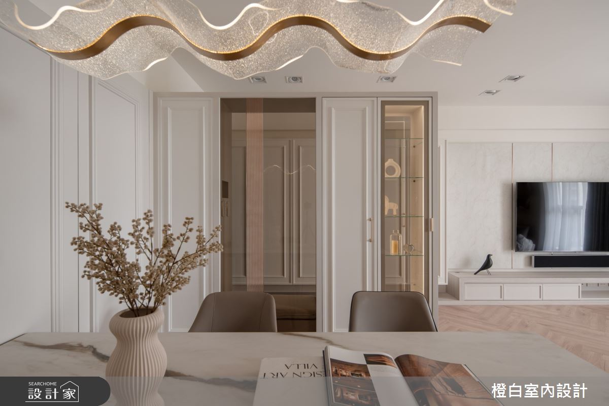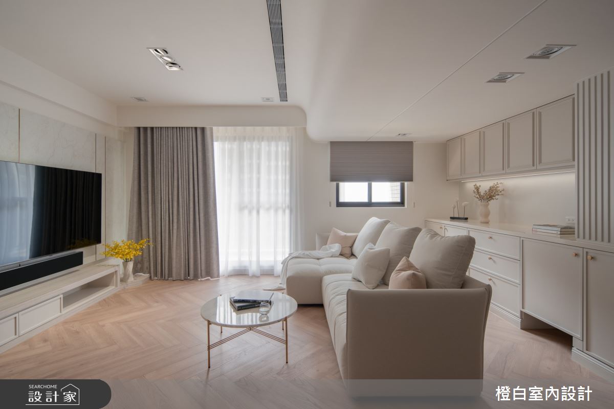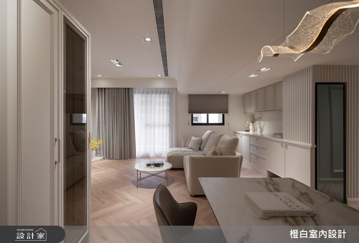 橙白室內裝修設計以線板烤漆、跳色乳膠漆、美耐板、波麗板、人字拼超耐磨木地板、優白清波、明鏡、茶色玻璃、茶色長虹玻璃、鐵件、鍍鈦條、花磚、人造石的搭配應用,呈現法式奶油風居家氛圍,將此間30坪、兩房、單層、新成屋(5年以下)打造成舒適愜意的家庭空間,完成2位大人全家人的夢想之居。