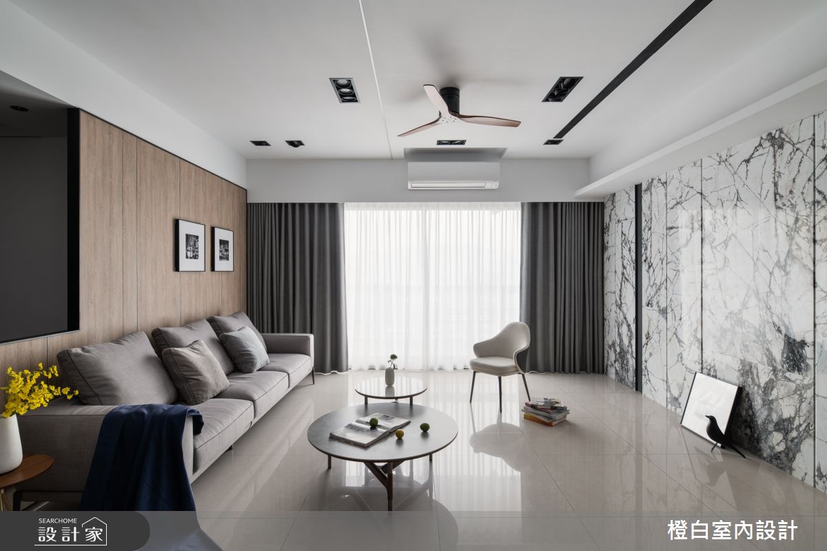 橙白室內裝修設計以大理石、美耐板、乳膠漆、鐵件、超耐磨木地板、磁磚、優的鋼石的搭配應用,呈現北歐風居家氛圍,將此間16坪、兩房、單層、老屋(16~30年)打造成舒適愜意的家庭空間,完成1位大人全家人的夢想之居。