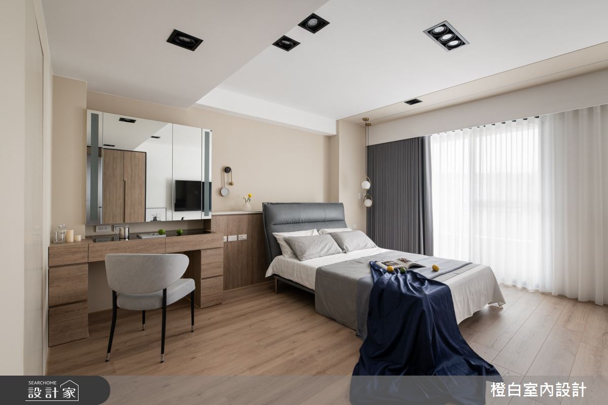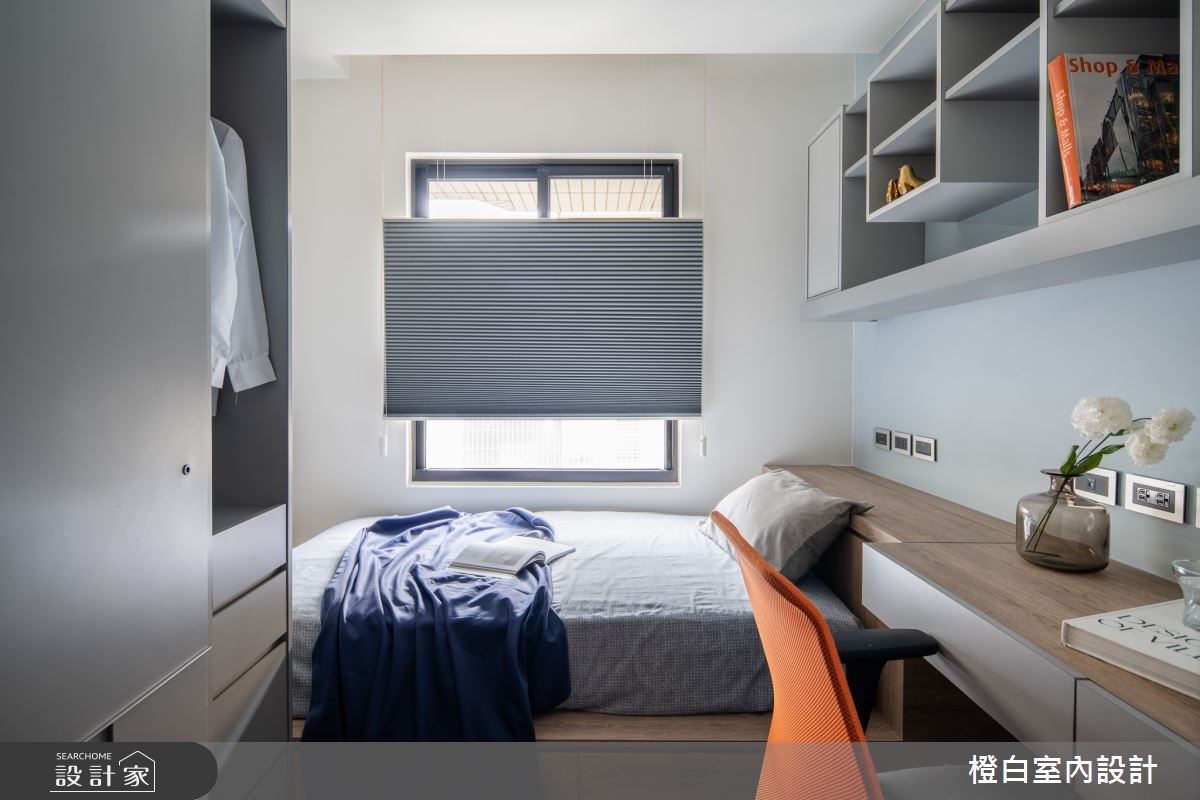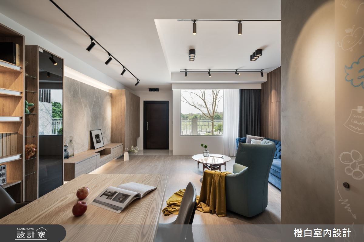 本案為橙白室內裝修設計的34坪混搭風新成屋(5年以下)設計作品,格局為單層四房的居住空間。居住成員包含2位大人、2位小孩。全室建材的搭配,應用鐵件烤漆、跳色漆、磁性黑板漆、美耐板、灰玻、灰鏡、長虹玻璃、小冰柱、銀彩石英石、銀狐大理石、銀河灰大理石、鋁條燈,展現溫馨的居家氛圍。