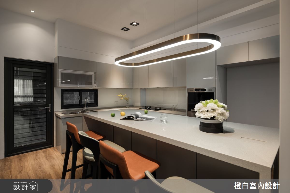 橙白室內裝修設計以鐵件烤漆、跳色漆、美耐板、仿大理石紋美耐板、灰玻、灰鏡、長虹玻璃、特殊金屬漆、人造石、超耐磨木地板、安格拉珍珠大理石、風琴簾、蛇型簾、鋁條燈、鐵件滑門的搭配應用,呈現現代風居家氛圍,將此間55坪、四房、單層、中古屋(5~15年)打造成舒適愜意的家庭空間,完成2位大人、2位小孩全家人的夢想之居。