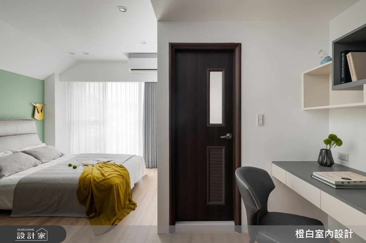 橙白室內裝修設計以鐵件烤漆、跳色漆、美耐板、灰玻、明鏡、長虹玻璃、超耐磨木地板、風琴簾、鋁條燈、木皮格柵的搭配應用,呈現現代風居家氛圍,將此間25坪、四房、單層、新成屋(5年以下)打造成舒適愜意的家庭空間,完成2位大人、3位小孩全家人的夢想之居。